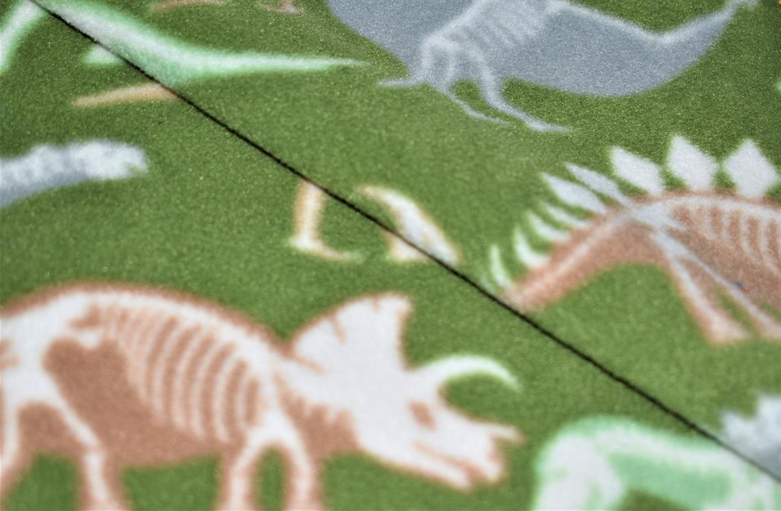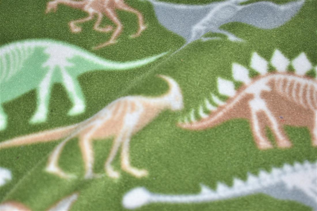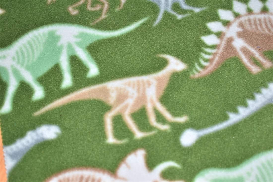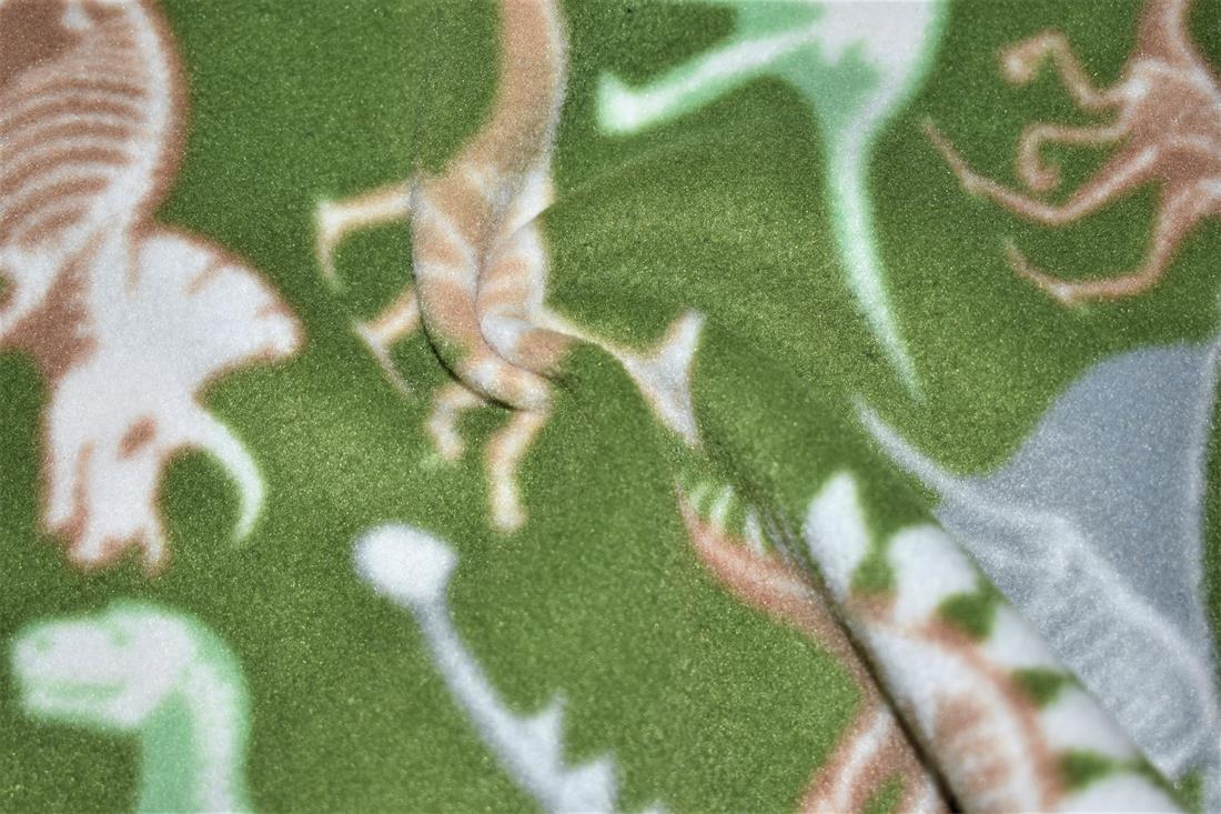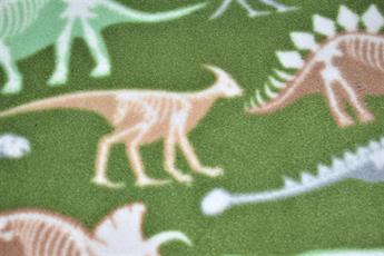 Dino Bones Printed Polar Fleece his fabric isn't A sight for saur eyes, I tell you that! Polar fleece is much thicker and warmer than microfleece. It's popular for blankets and jackets in colder climates, a soft napped insulating fabric made from polyester. This polar fleece features adorable dinosaurs and bones pattern against a dark olive-coloured background. Composition: 100% polyester Weight: 260gsm Width: 152cm