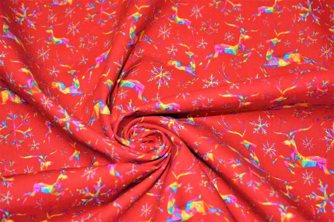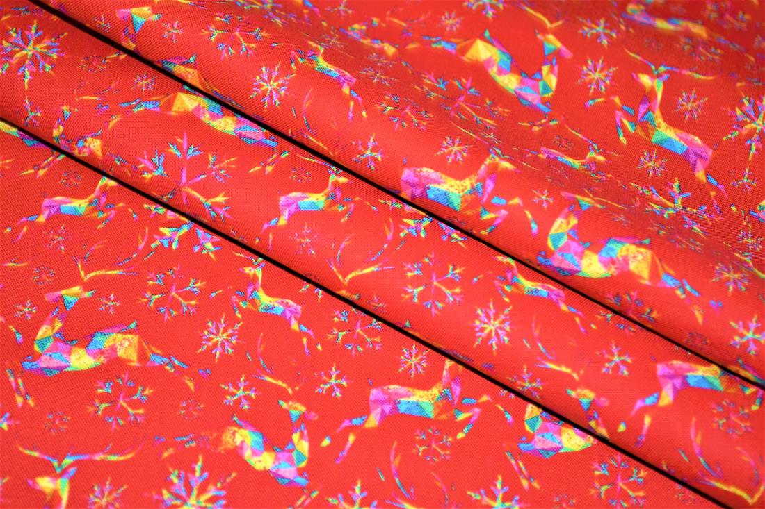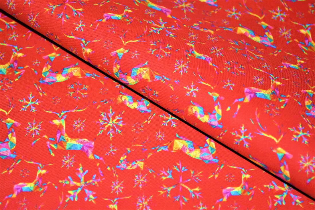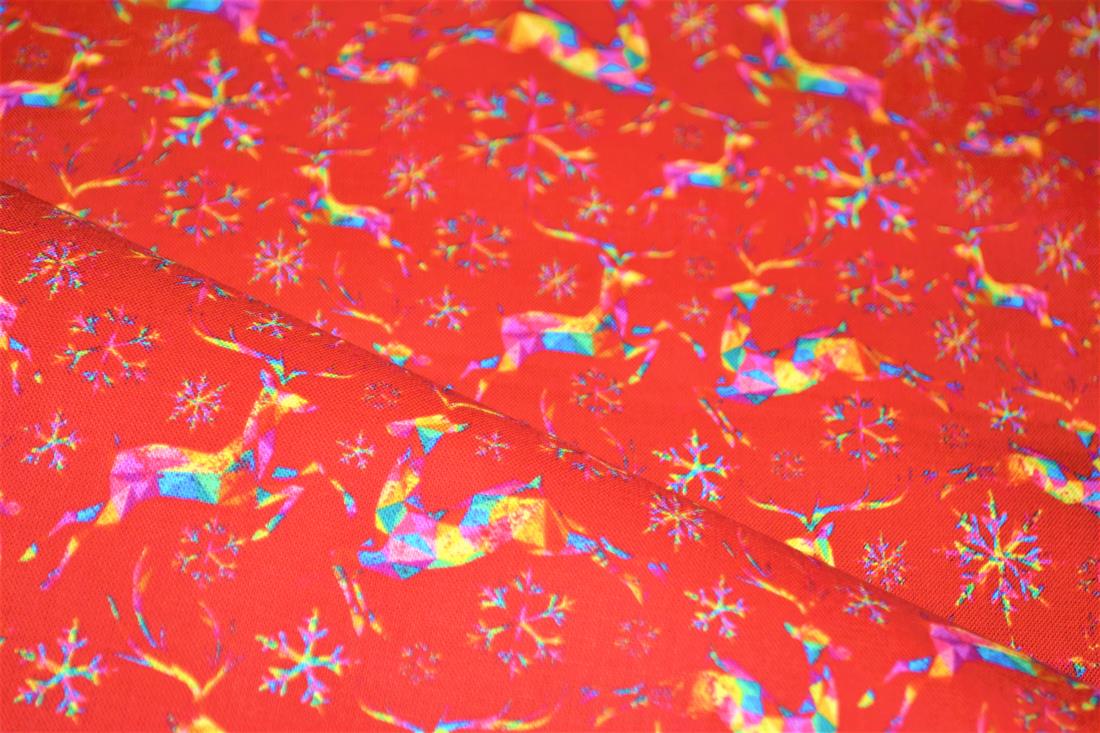 A beautiful festive Cotton with a fun rainbow and gold snowflake and reindeer design.