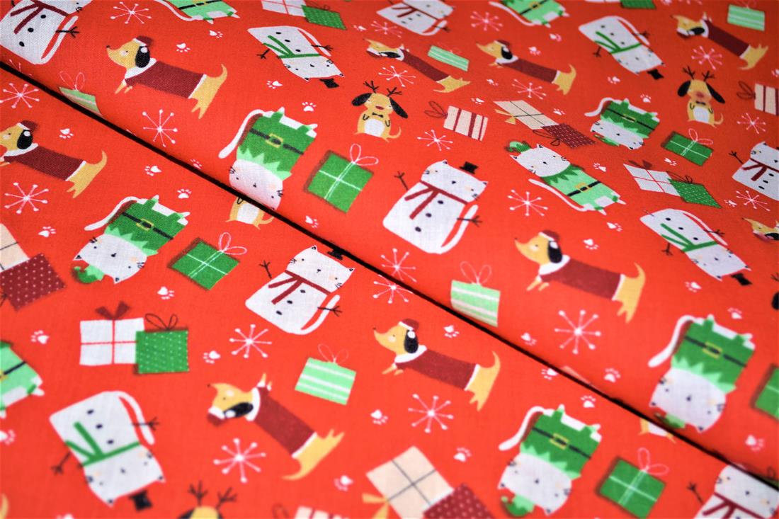 This Polycotton fabric features an endearing design of some seriously festive pets. This design includes some cats who think they are snowmen and elves and some cute dogs who want to be Santa or his reindeer. These designs are set against either a green, red or navy block coloured background. Be inspired by these spirited pets and get creative this Christmas.