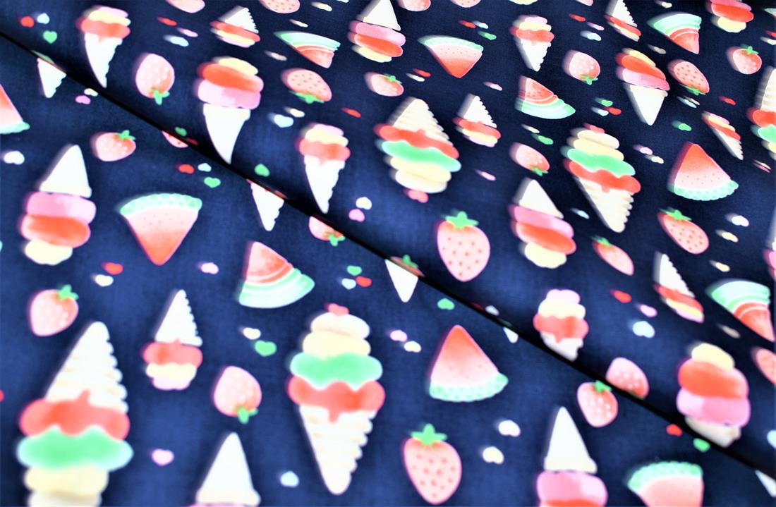 Ice Cream Printed 100% Cotton Poplin Fabric Fabric is characterised by its distinctive ribbed texture and tightly closed weave that gives the fabric a lovely luster. 100% cotton poplin combines the lightness of cotton with the strength of poplin making it thin and cool with an easy drape, whilst being sturdy and tough. This is an ideal fabric for dress making, upholstery, uniforms, shirts and skirts, trousers and shackets and more. Composition: 100% Cotton Weight: 135gsm Width: 112cm