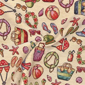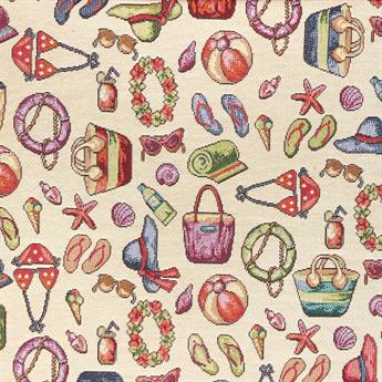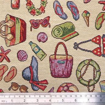 On The Beach Printed Luxury Weight Tapestry Cotton Rich Fabric, Hight Quality.- Fabric is cut from the roll and multiple purchases will be cut in one continuous piece. -Please note colours may vary slightly due to different screen settings, if you have any doubt about a certain colour or shade- 54" Wide Range: New World Tapestry Width 140cm Weight 360gr/m2 Composition 80% Cotton 20% Polyester Roll Length 15Mtr or 30Mtr Washing 30 degrees