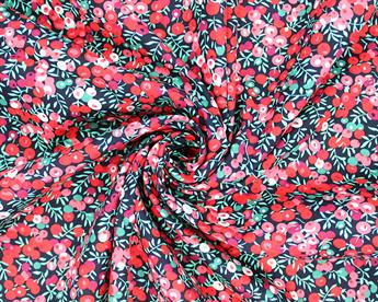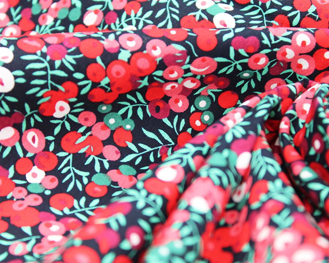 Wild Berries Cotton Poplin Featuring a ditsy design of juicy summer berries on the vine that has a vintage vibe and comes in a selection of colour ways. Poplin fabric is characterised by its distinctive ribbed texture and tightly closed weave that gives the fabric a lovely luster. 100% cotton poplin combines the lightness of cotton with the strength of poplin making it thin and cool with an easy drape, whilst being sturdy and tough. This is an ideal fabric for dress making, upholstery, uniforms, shirts and skirts, trousers and shackets and more. Composition: 100% Cotton Weight: 105gsm Width: 149cm