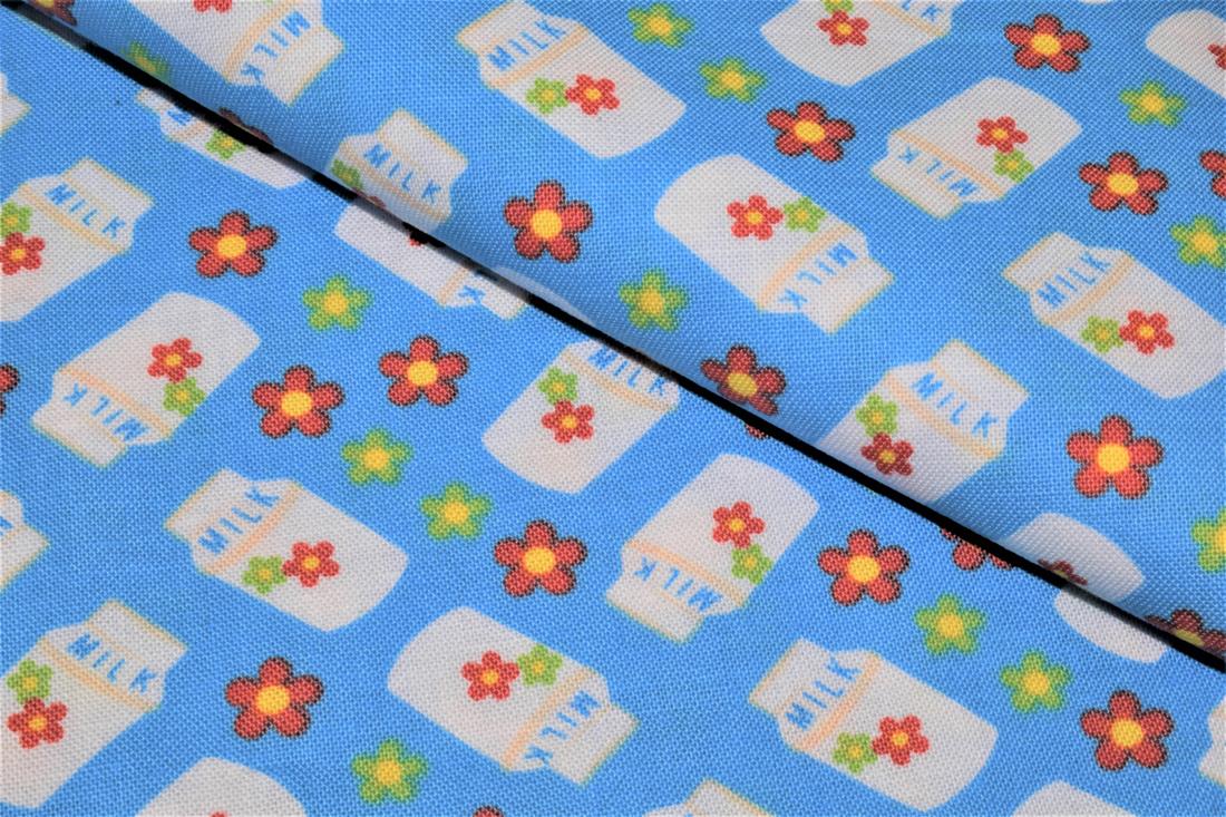 Milk Bottle Printed 100% Cotton Fabric, 112cm Wide, High Quality; 2 Colours This fabric is perfect for children's clothes, bed sheets, pillow cases, curtains, cushion- covers, patchwork, and for craft projects. Colours may slightly vary due to the lighting during the photo shooting or the monitor's display.