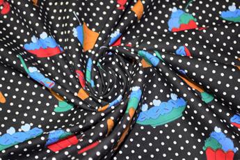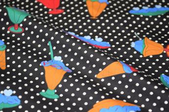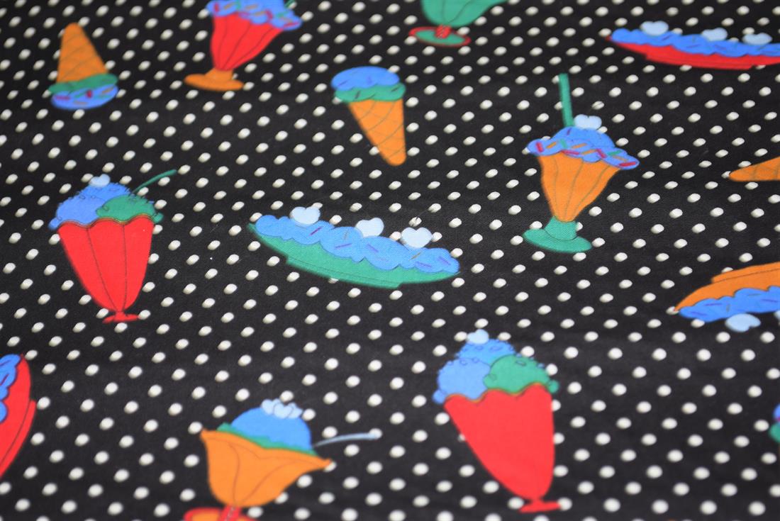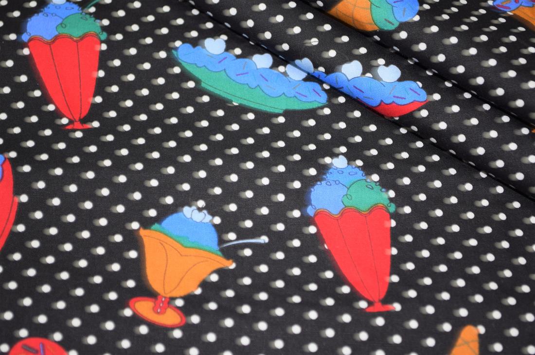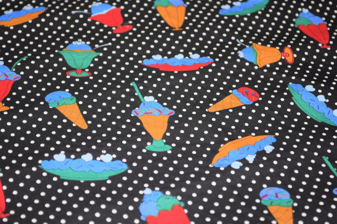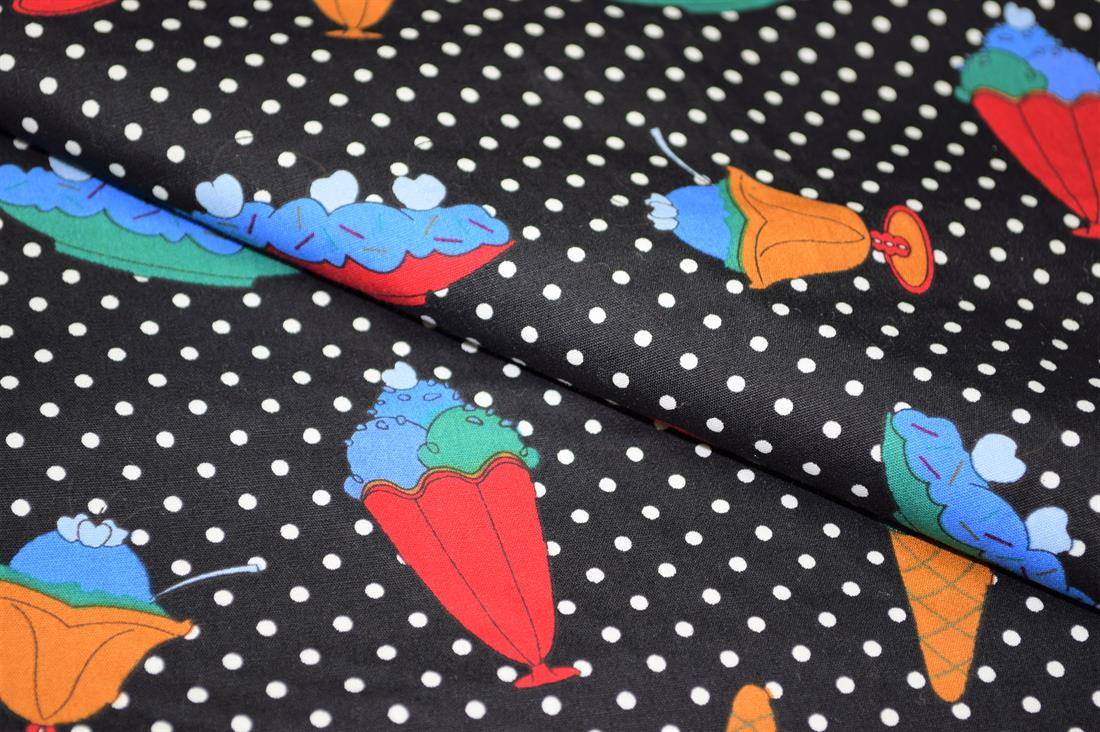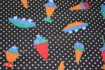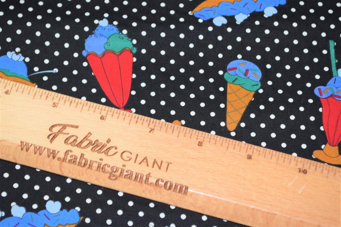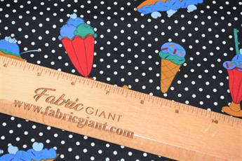 Black Printed 100% Cotton, Ice-cream & Dots Print, 112cm Wide, High Quality; This lovely fabric is great for dressmaking, quilting, patchwork, bed sheets, pillow cases, curtains, face masks/coverings, and for craft projects. Colours may slightly vary due to the lighting during the photo shooting or the monitor's display. Wash at 30degree.