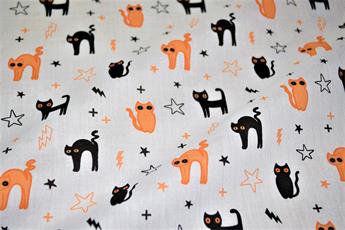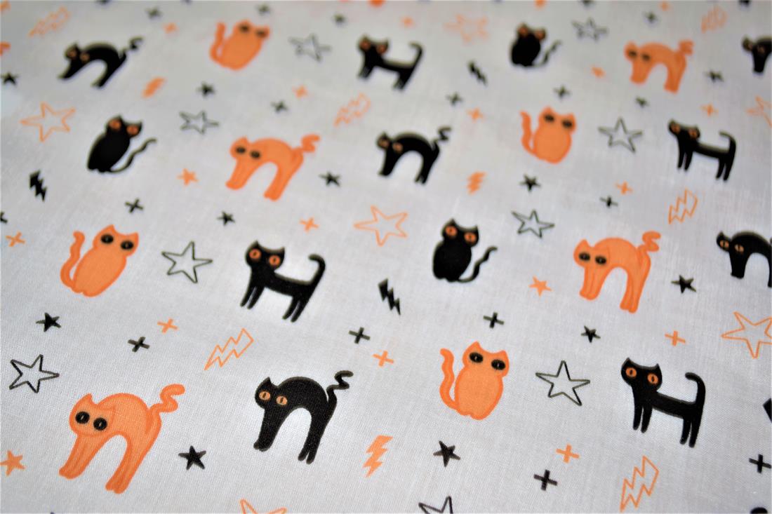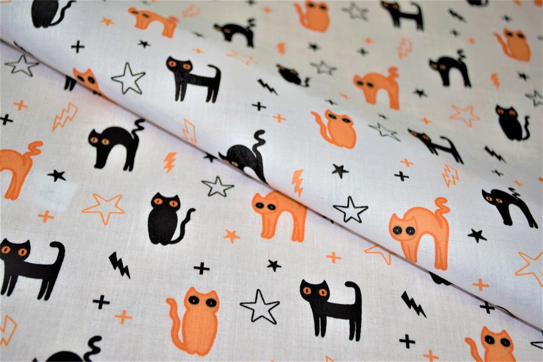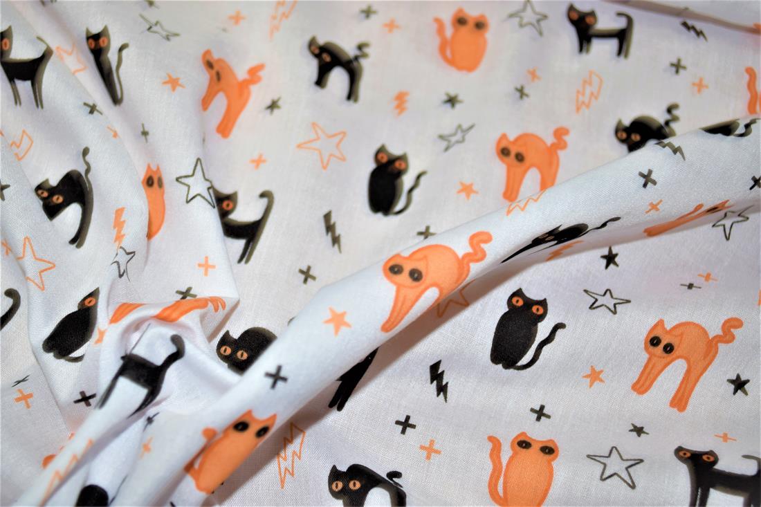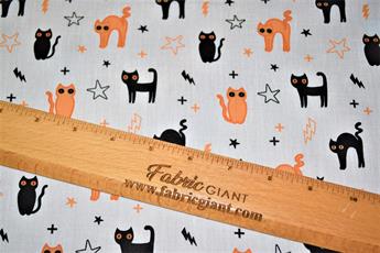 Haloween Cats- Premium Printed Poly Cotton Fabric, Halloween Print 112cm Wide, High Quality; This lightweight fabric is great for dressmaking, quilting, patchwork, bed sheets, pillow cases, curtains, face masks/coverings, and for craft projects. Colours may slightly vary due to the lighting during the photo shooting or the monitor's display.