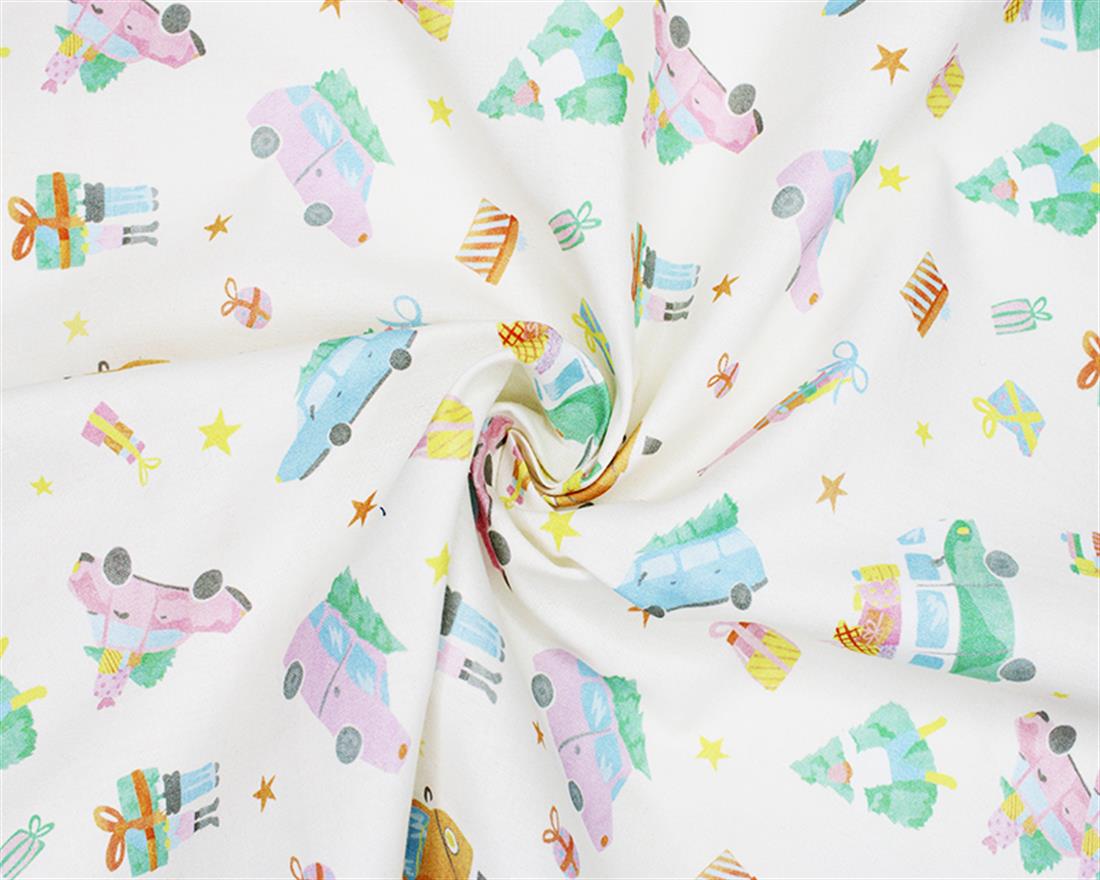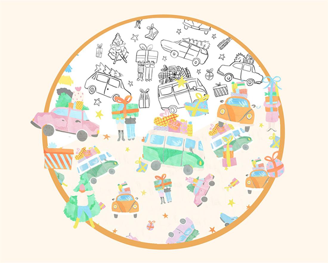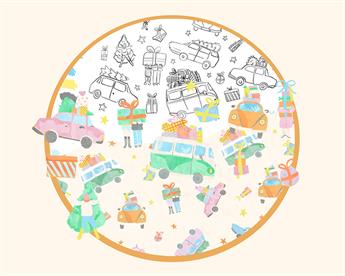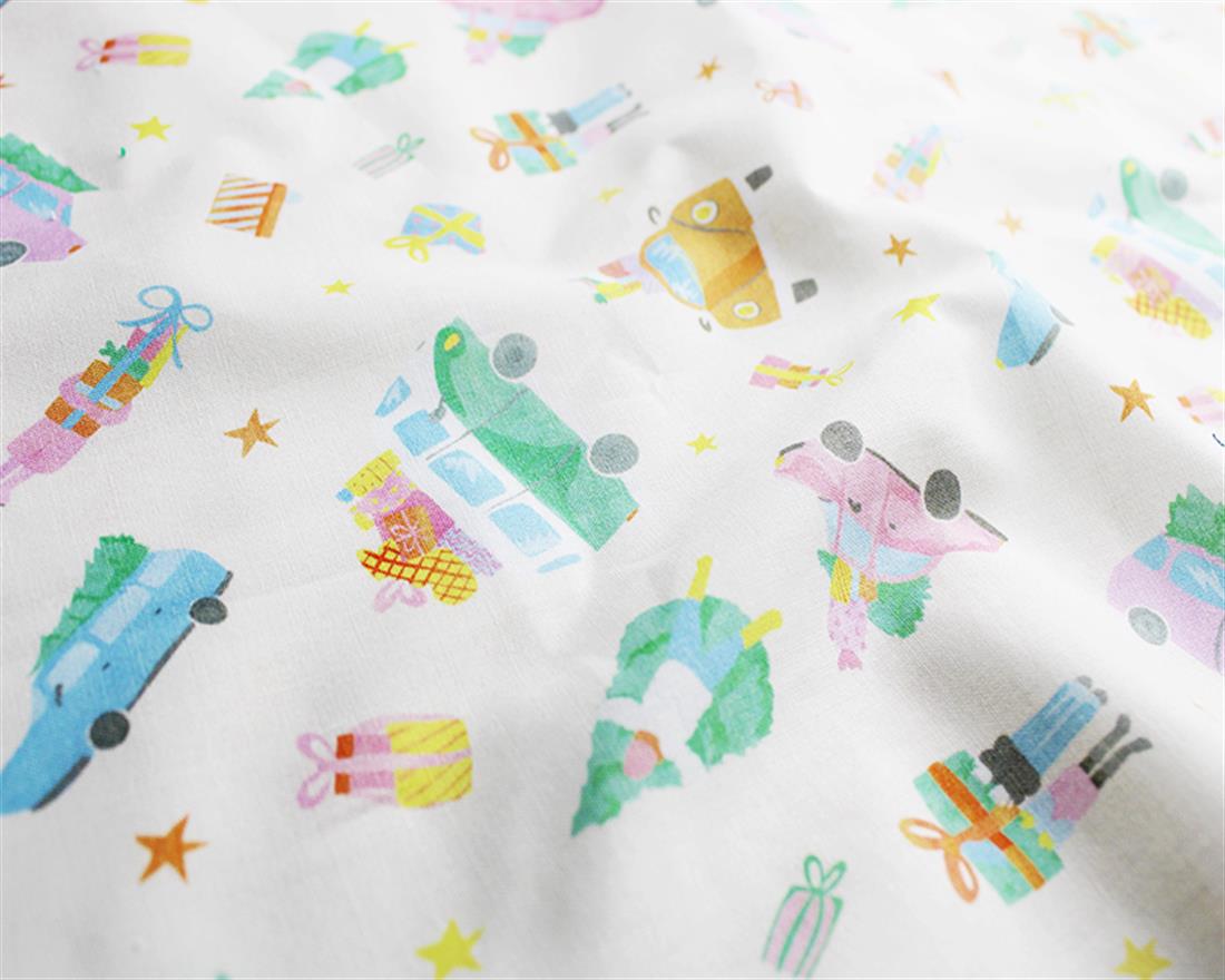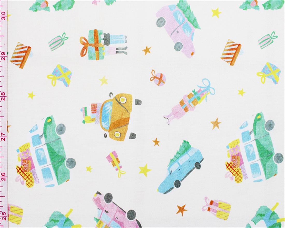 This fun, frivolous, quirky, christmas fabric is an homage to the gift giving and coming together that encompases chrismas time. Featuring characters juggling presents and trees as well as cars and vans loaded with presents and trees, making their way home for christmas. this is set about with more presents and stars, all set against a warm off white background.