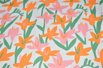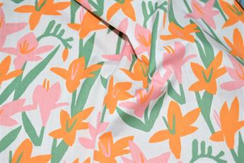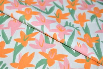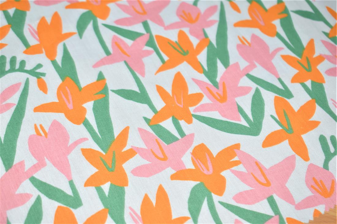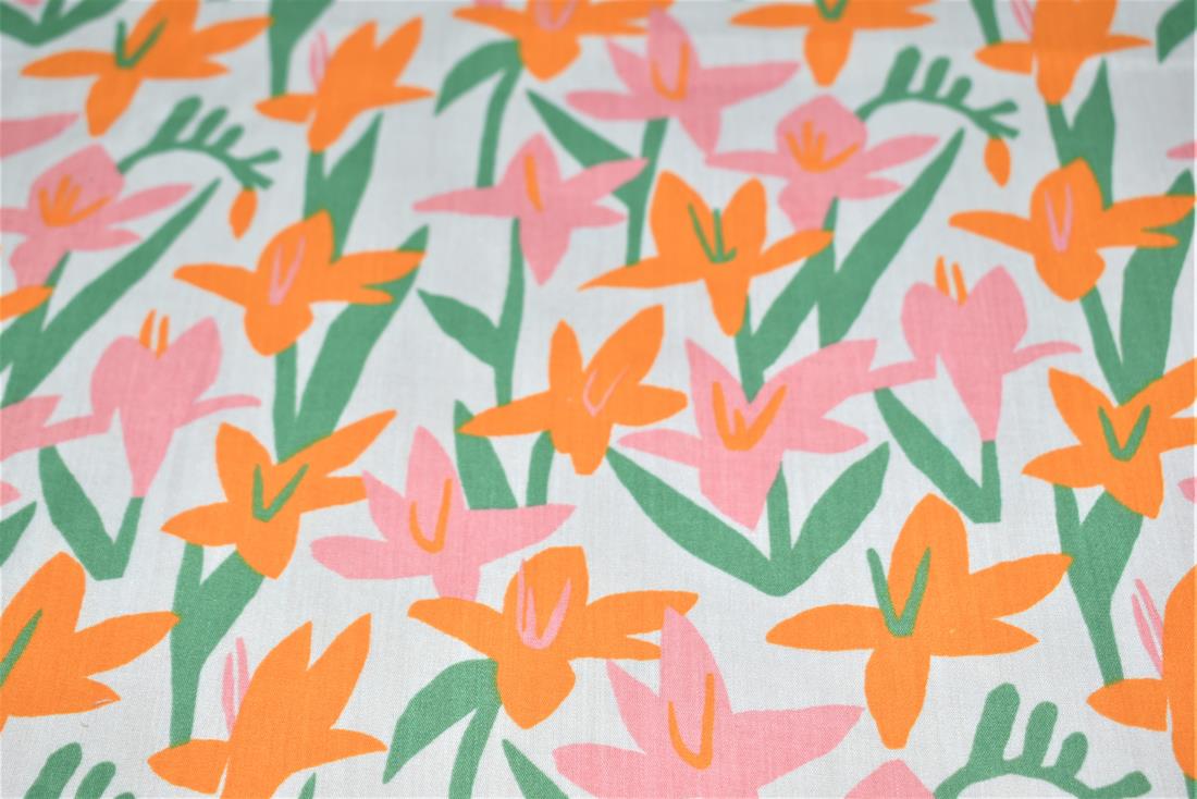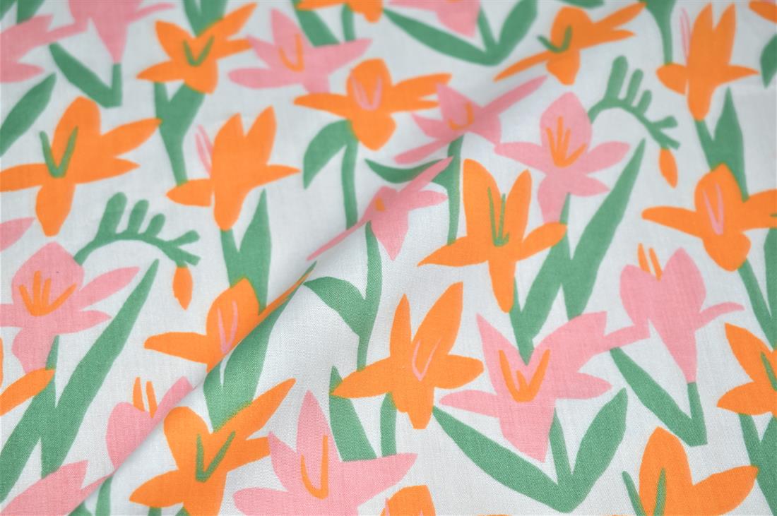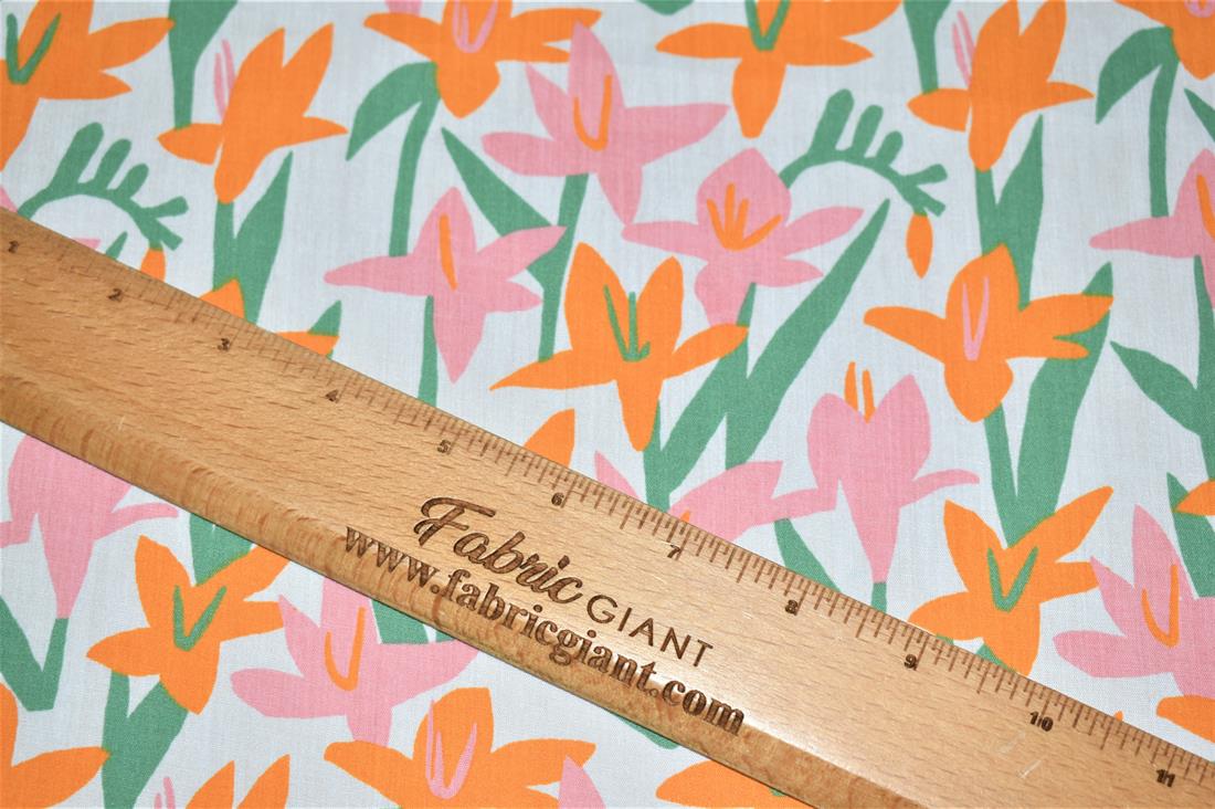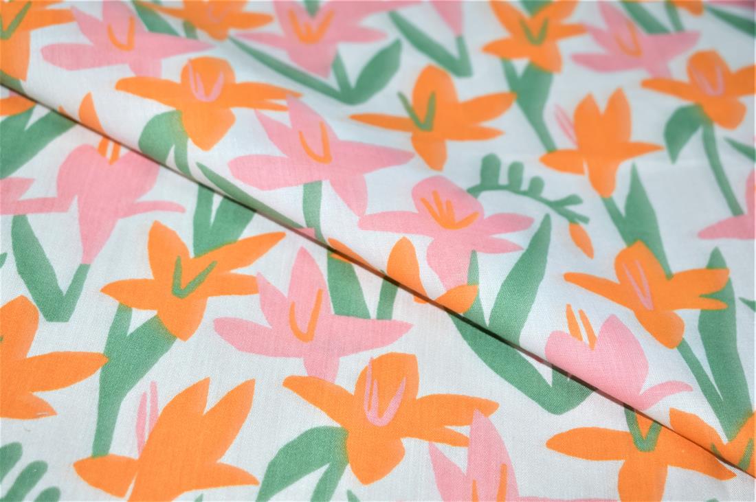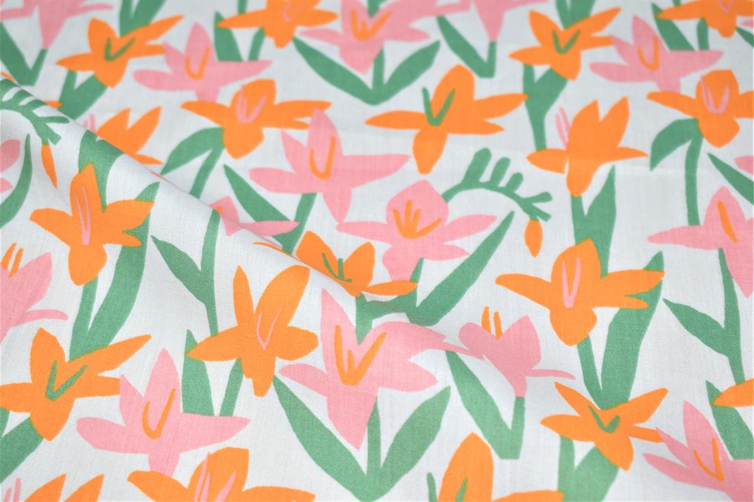 Florals Lily brand new, hand selected, one of a kind, vintage designs on a beautiful, high quality, polycotton base that is our softest to date and durable This is a fabric made from a blend of polyester and cotton, popularly combined to make clothing, bed sheets and pillow cases. The blend is perfect for many items as it brings both benefits of the two fabrics together. Composition: 65% Polyester 35% Cotton Weight: 95gsm Width: 112cm