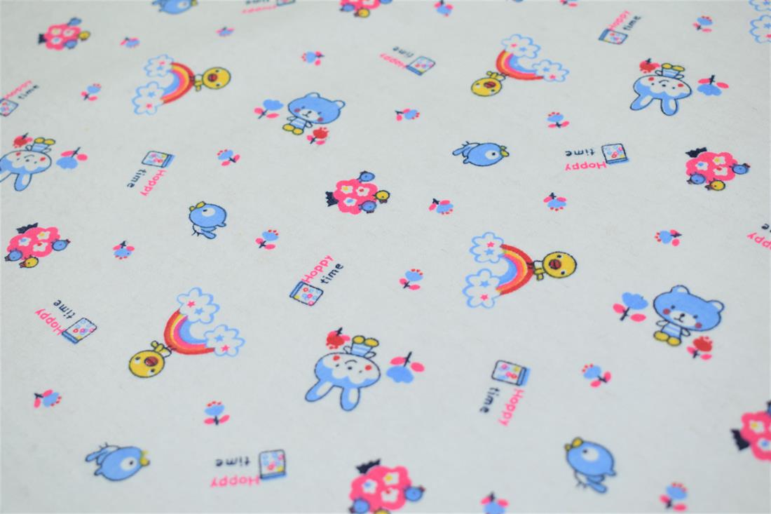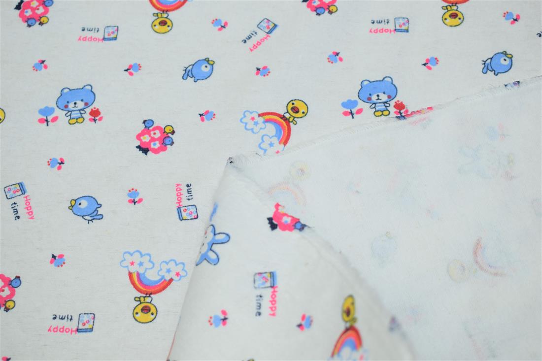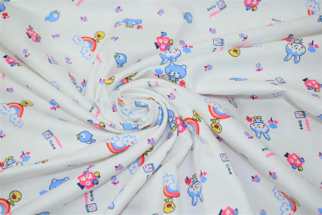 100% Brushed Cotton Fabric, Happy Time Winceyette Print, 112cm Wide, High Quality; Weight: 145gsm Winceyette, also referred to as brushed cotton or flannel and raised brushed surface (a nap), on both sides. This beautiful soft fabric is perfect for Baby clothing, Blankets, Bedding, Night dresses. Colours may slightly vary due to the lighting during the photo shooting or the monitor's display.