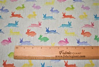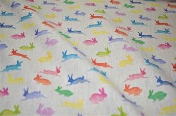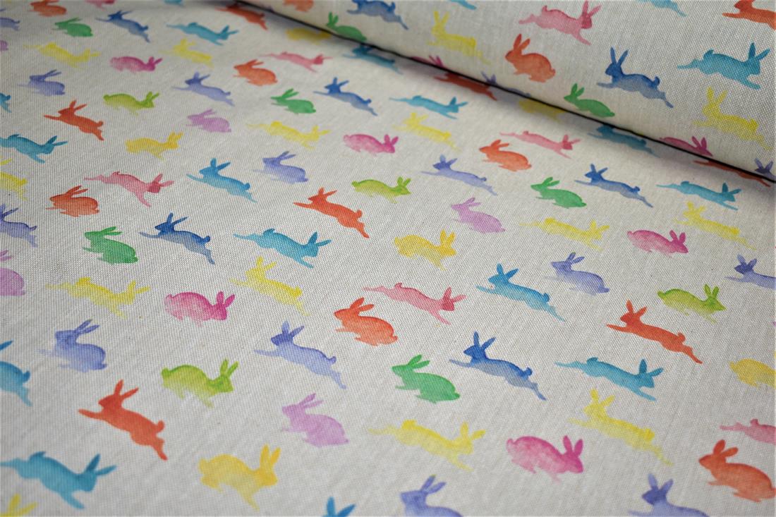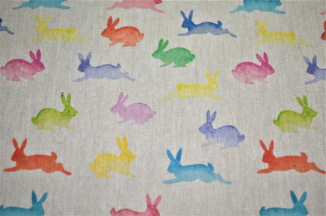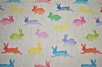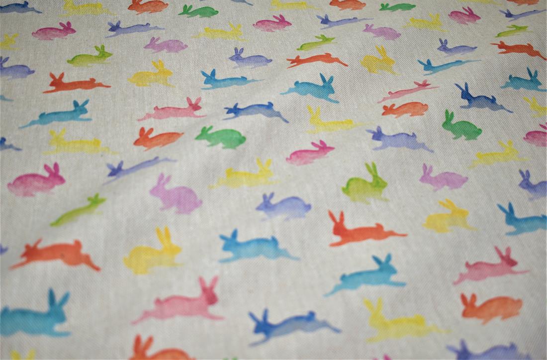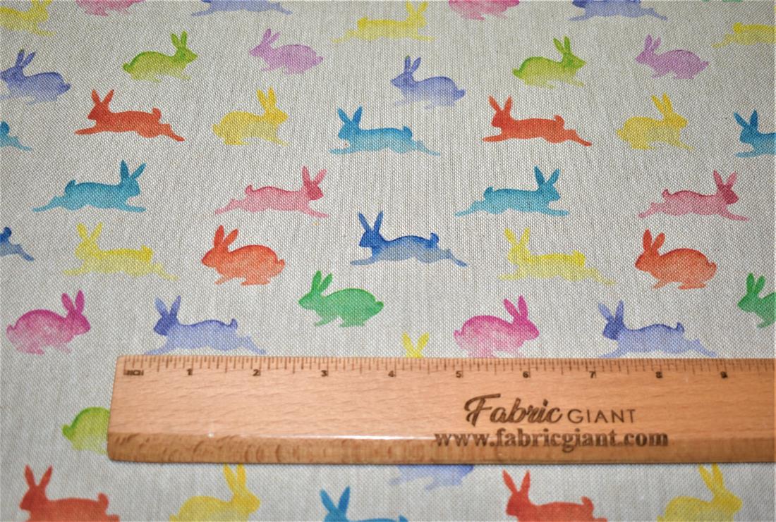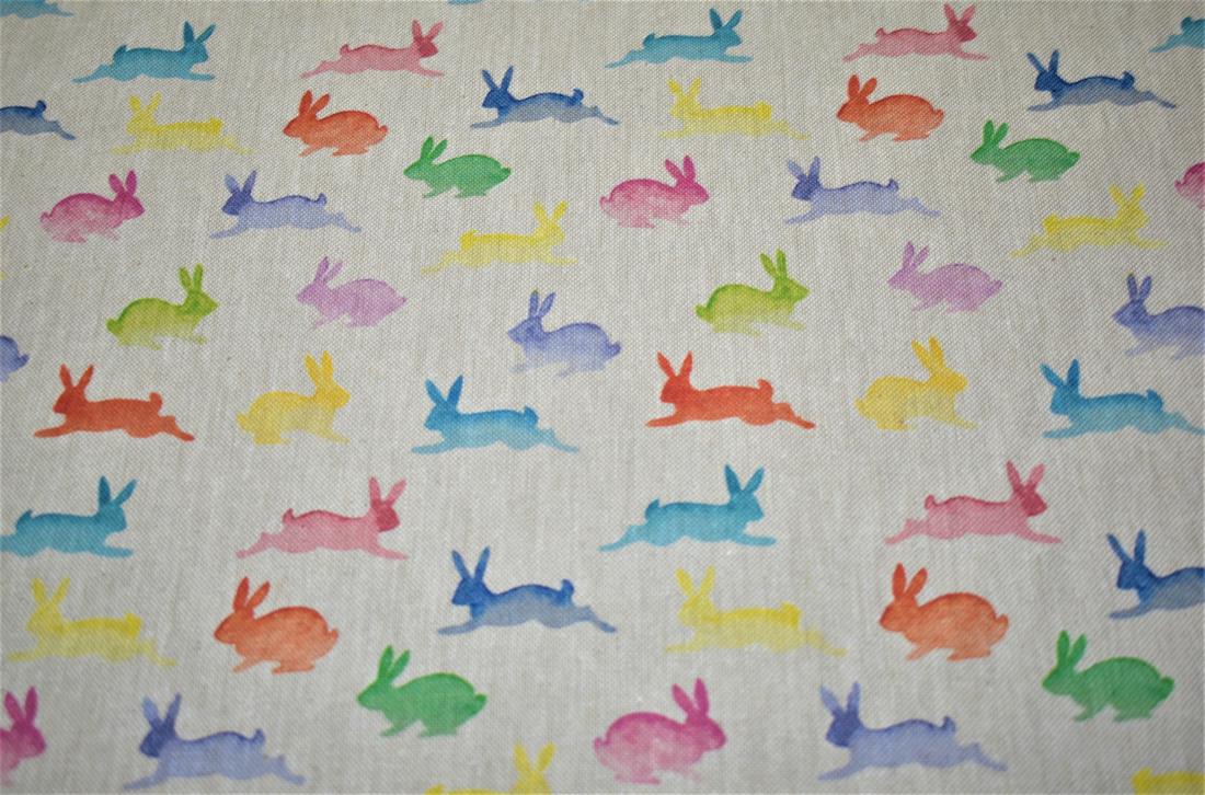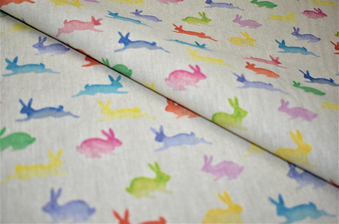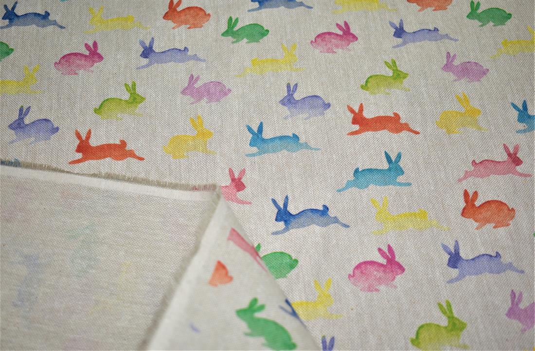 Rainbow Rabbits - Printed Digital Canvas Fabric, Cotton Rich Linen Look.