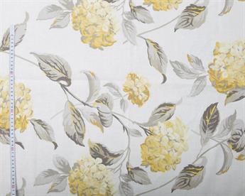 Celebrate timeless British florals with Laura Ashley Hydrangea Camomile. This striking canvas-weight cotton-linen blend features painterly hydrangea clusters in warm camomile yellows with soft grey-green leaves, set on a fresh white base. The design evokes country gardens in bloom, perfect for creating a bright, inviting feel in any space.