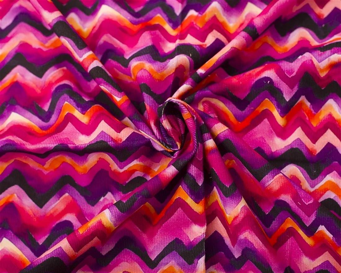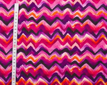 Inject bold energy into your makes with this eye-catching zigzag print from Little Johnny. Featuring a vibrant digital design in rich purples and coordinating hues, this fabric adds a fun and modern twist to garments, crafts, and accessories. The digitally printed pattern ensures crisp detail that pops on the soft, fine needlecord texture.