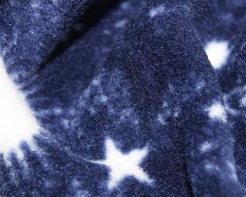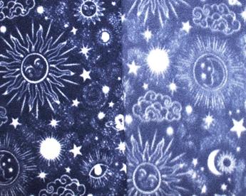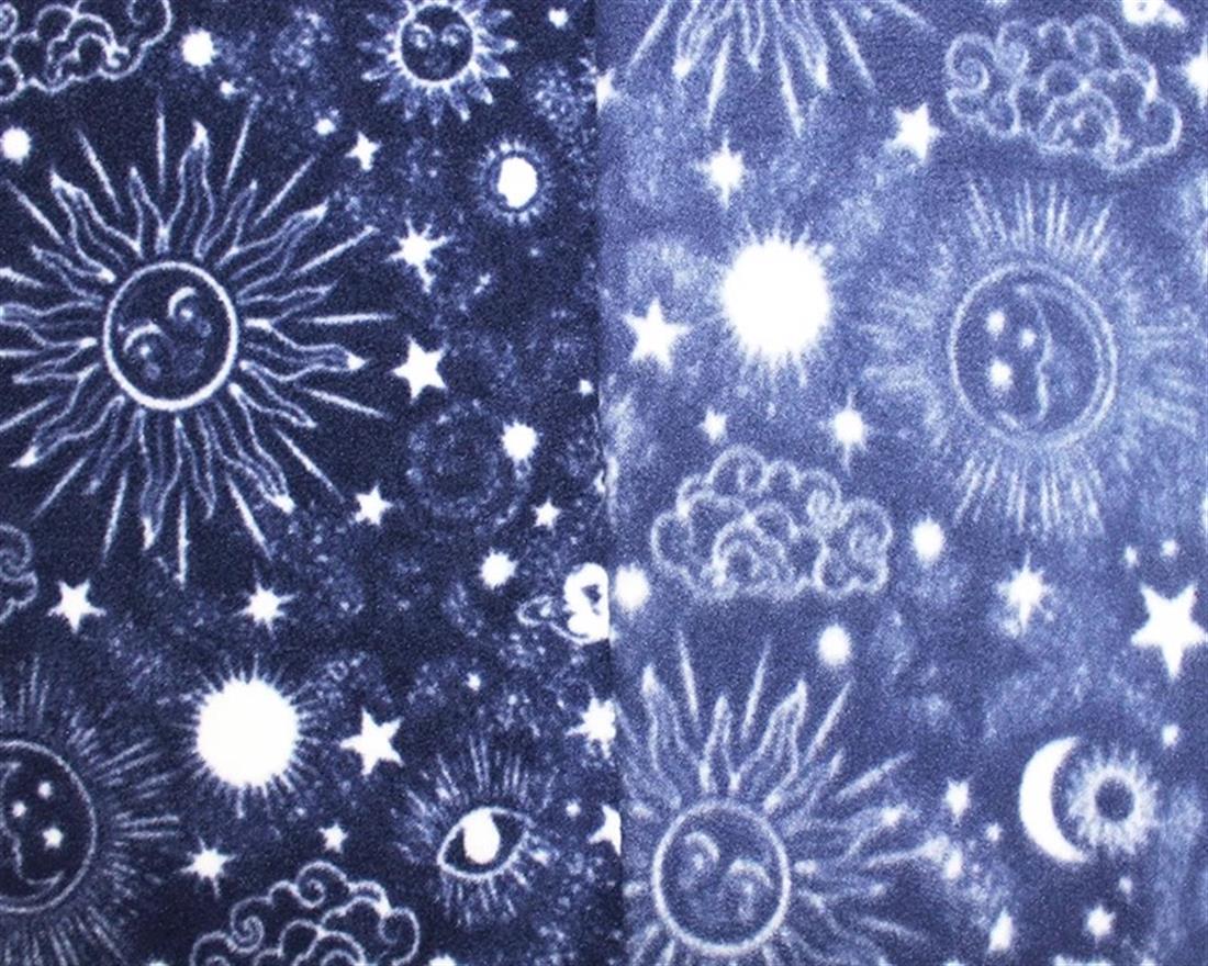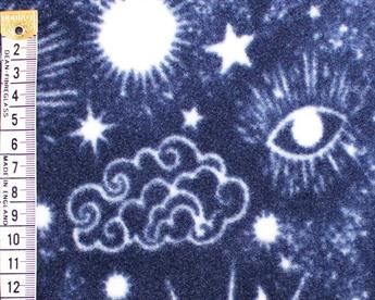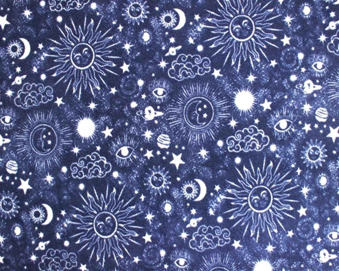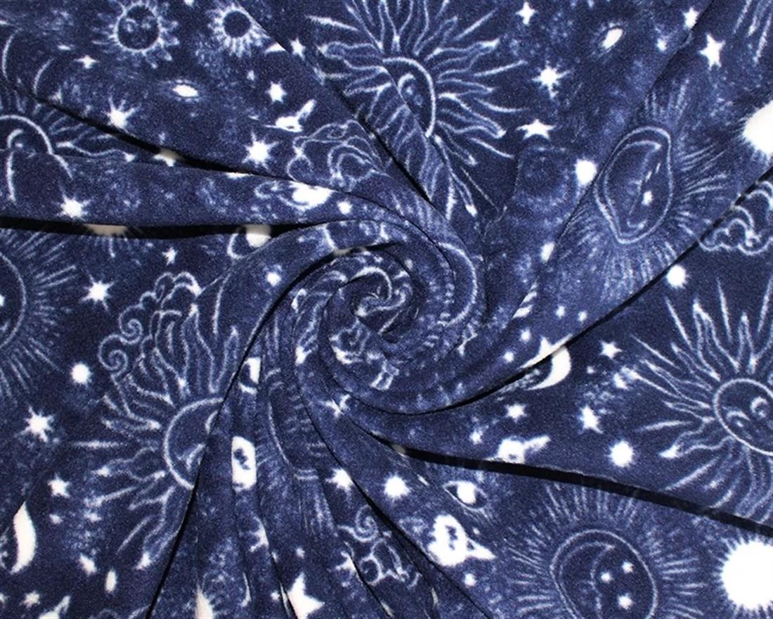 This polar fleece features astrological styled symbols of the sun, the moon, clouds, planets, and stars on a blue background.