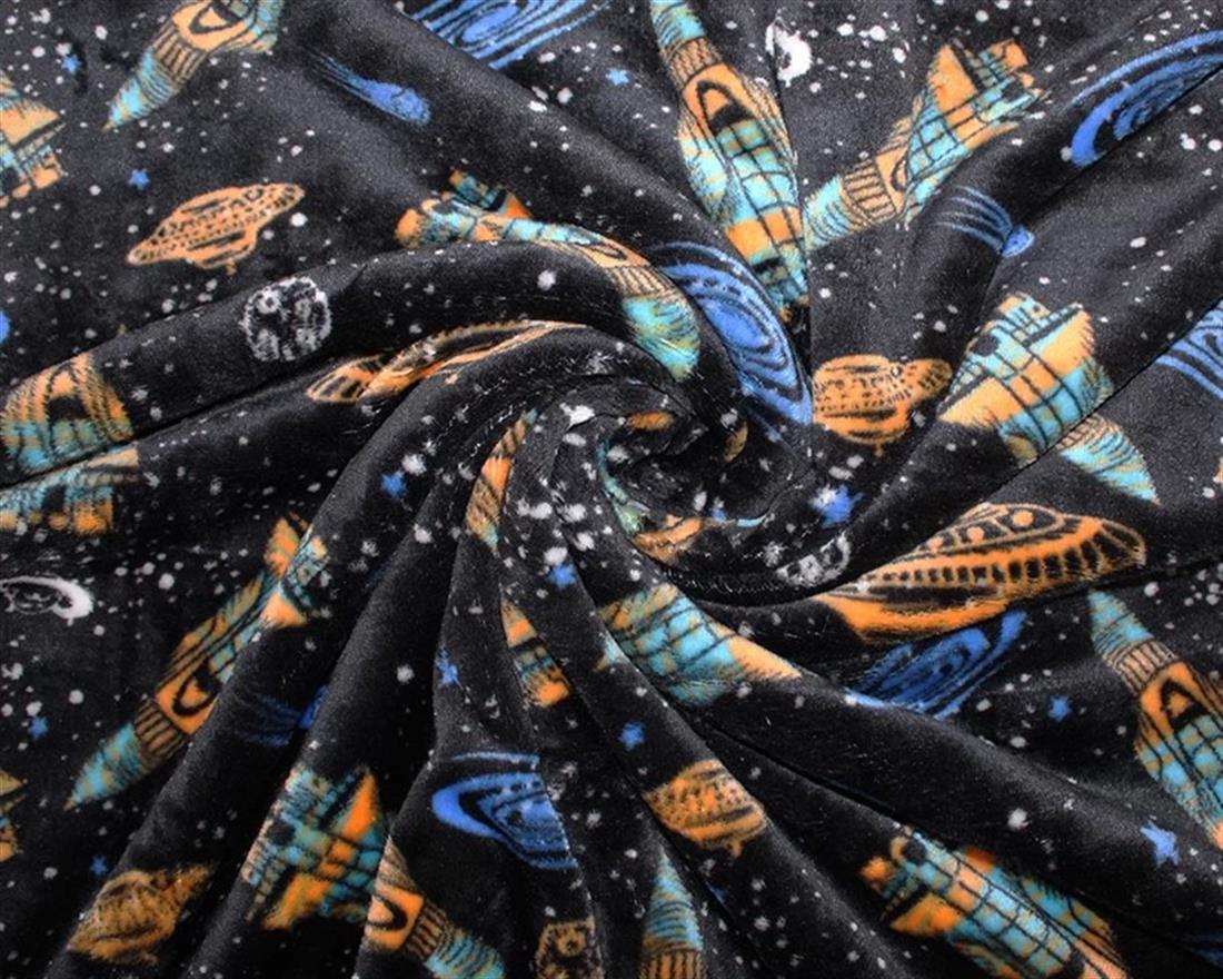 This cozy fabric features rockets, UFOs, meteors, and asteroids in starry space.