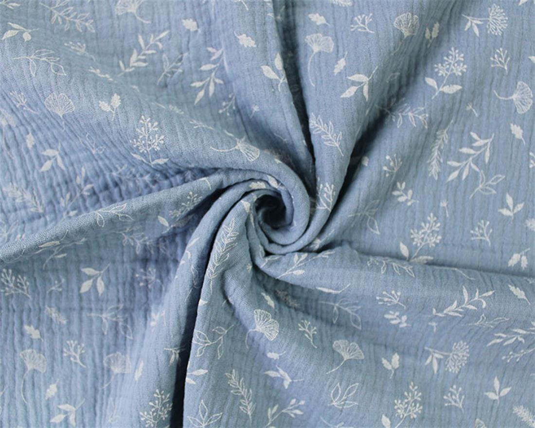 Double gauze is a fabric that consists of two layers of fine open woven cotton. They are attached with tiny stab stitches at regular intervals, usually every centimetre, in a grid pattern, though this is barely visible. It is incredibly soft to the touch and can be a tiny bit transparent.