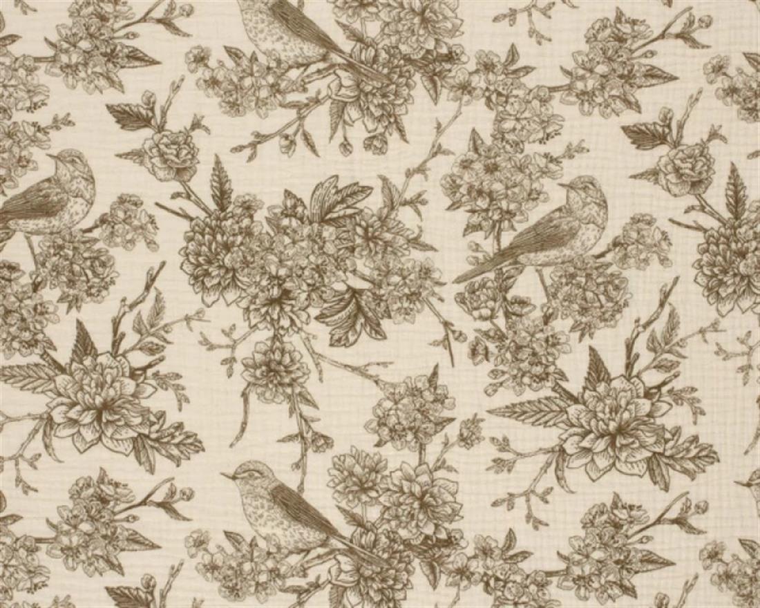 tropical birds, and leafy palms—in earthy brown on a natural cotton base.