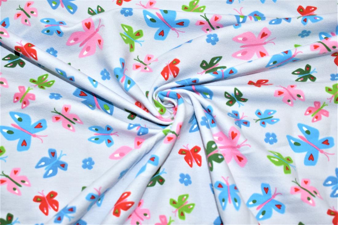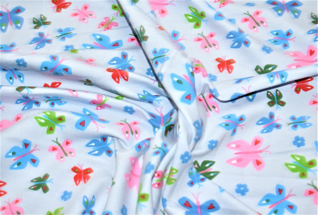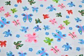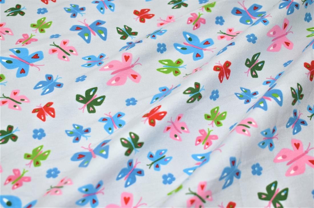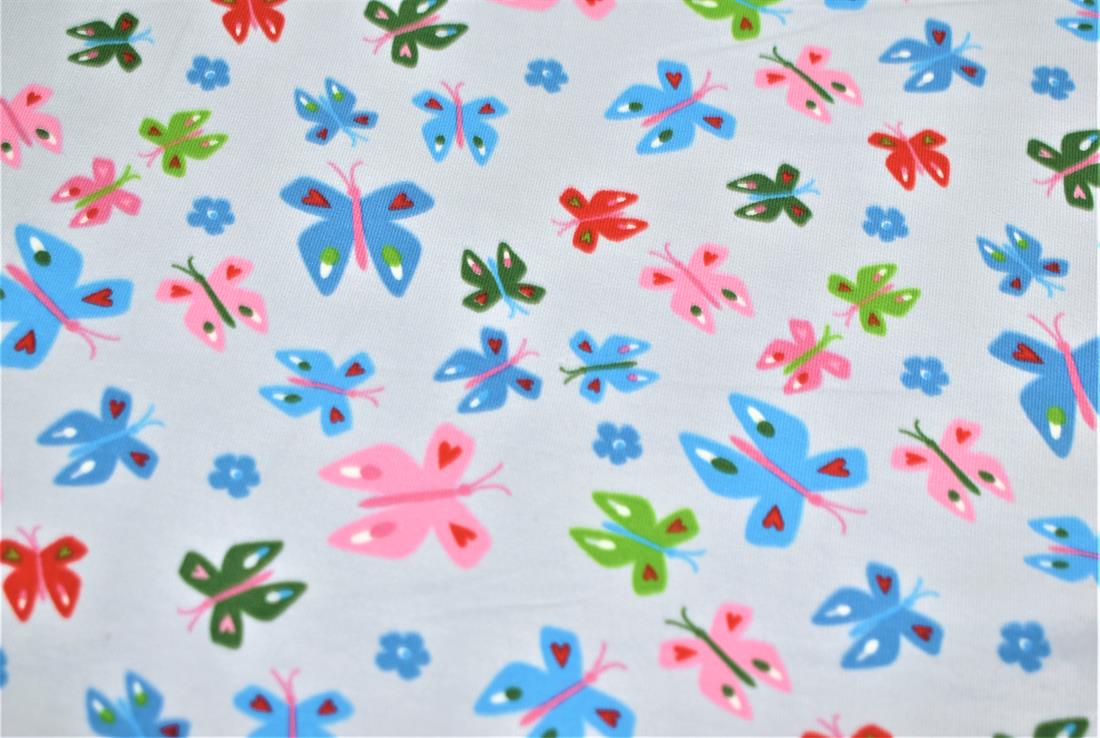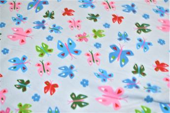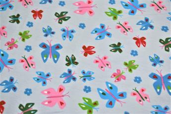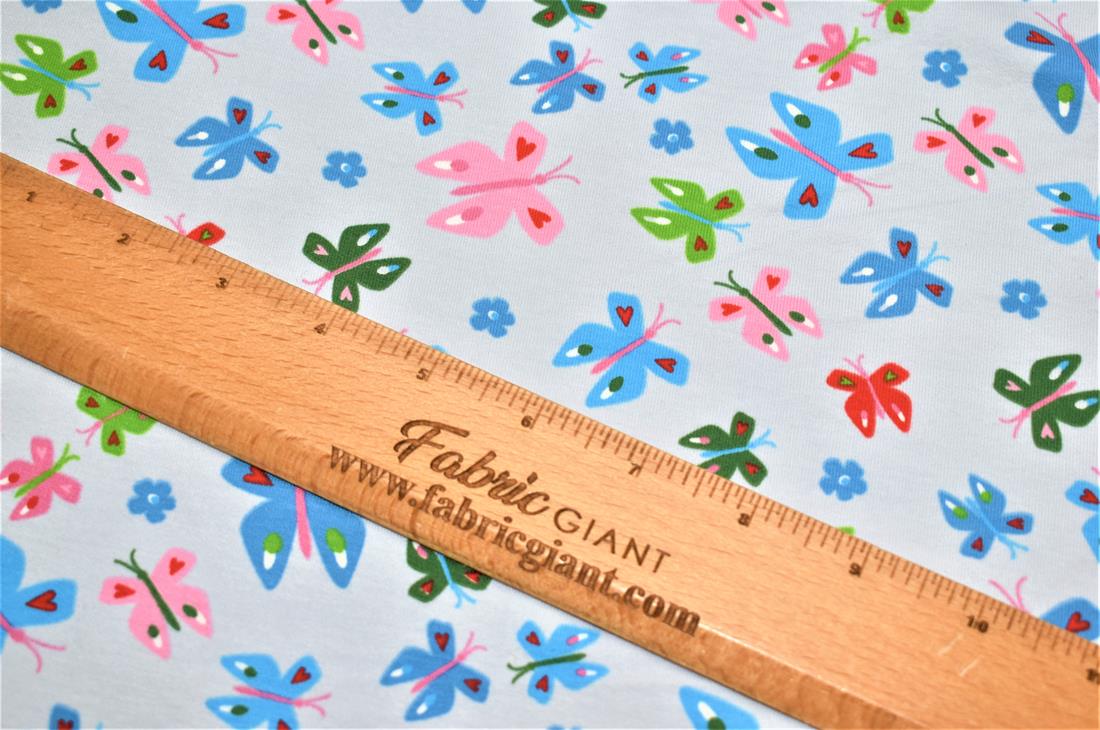 This French Terry Jersey features a simple yet effective butterfly design that also features love hearts and flowers set against either a silver or baby pink background.