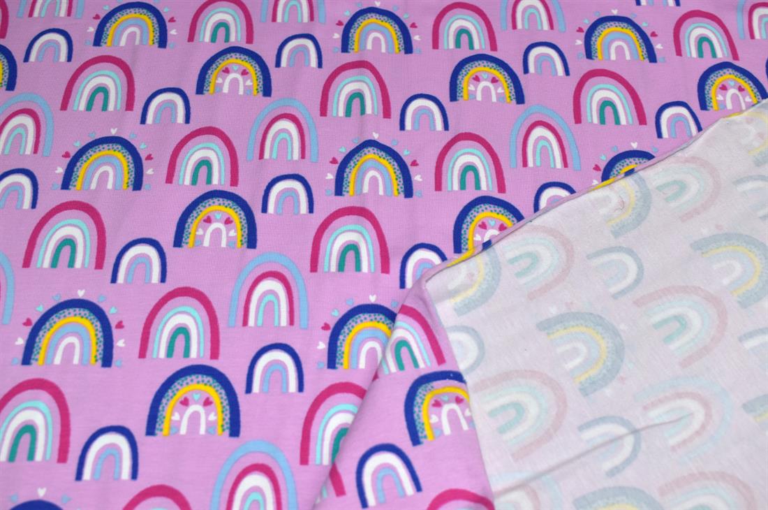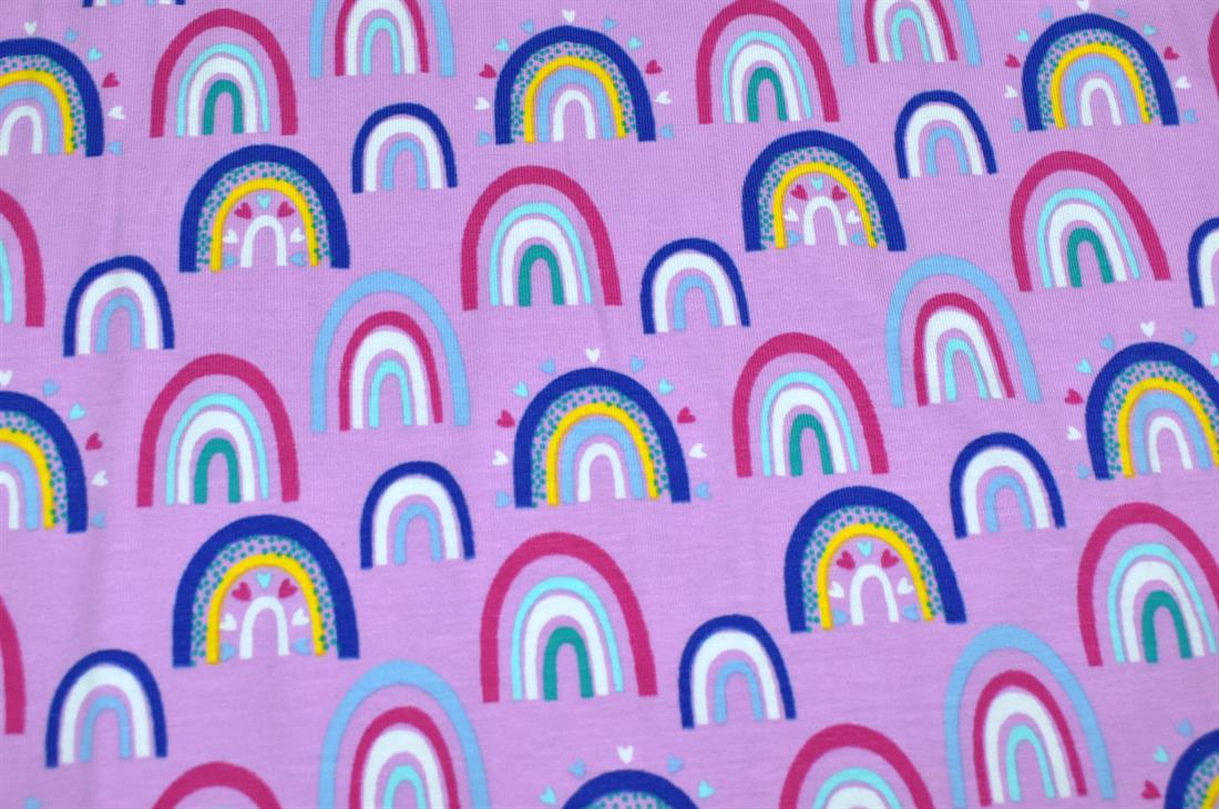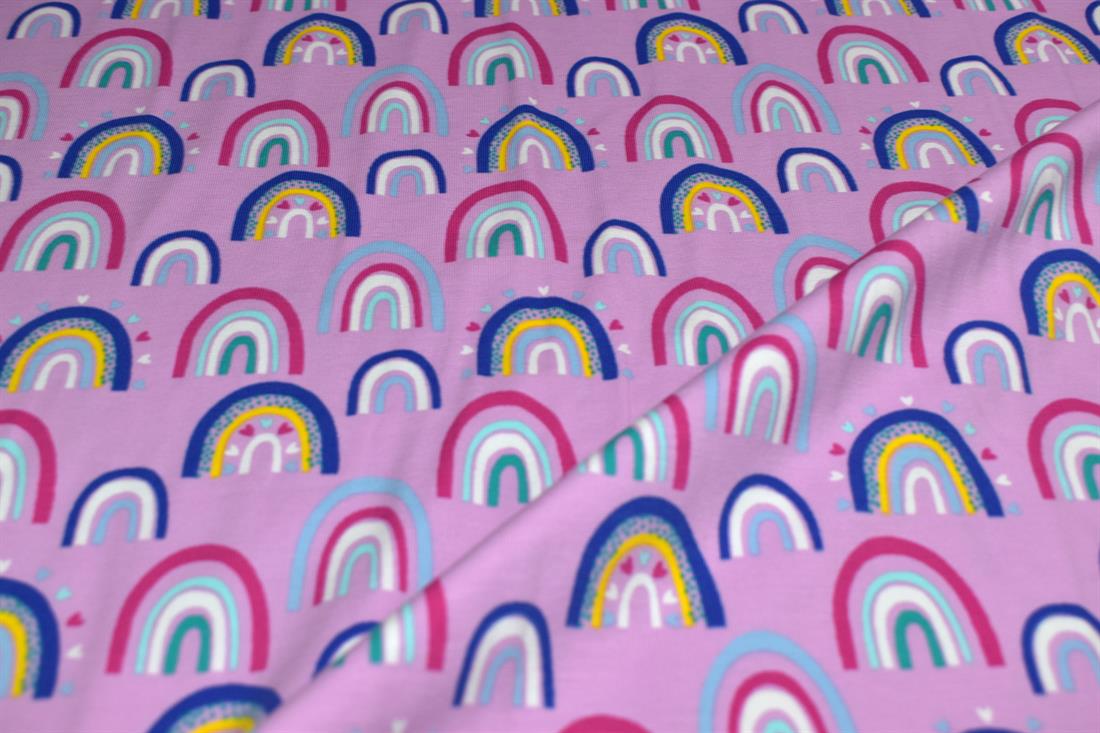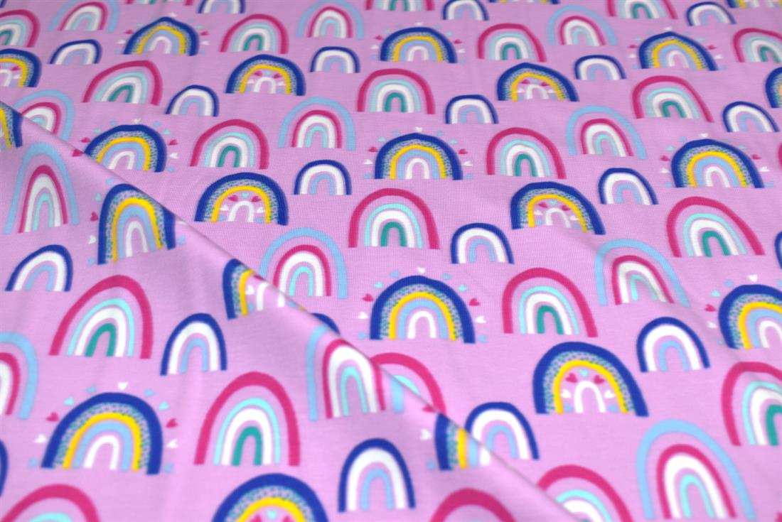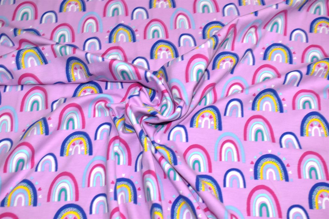 Rainbow Arches Cotton Jersey. Bright, fun, multi coloured. Soft jersey fabric perfect for clothing, dress making, crafts and homeware.