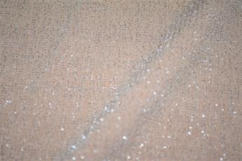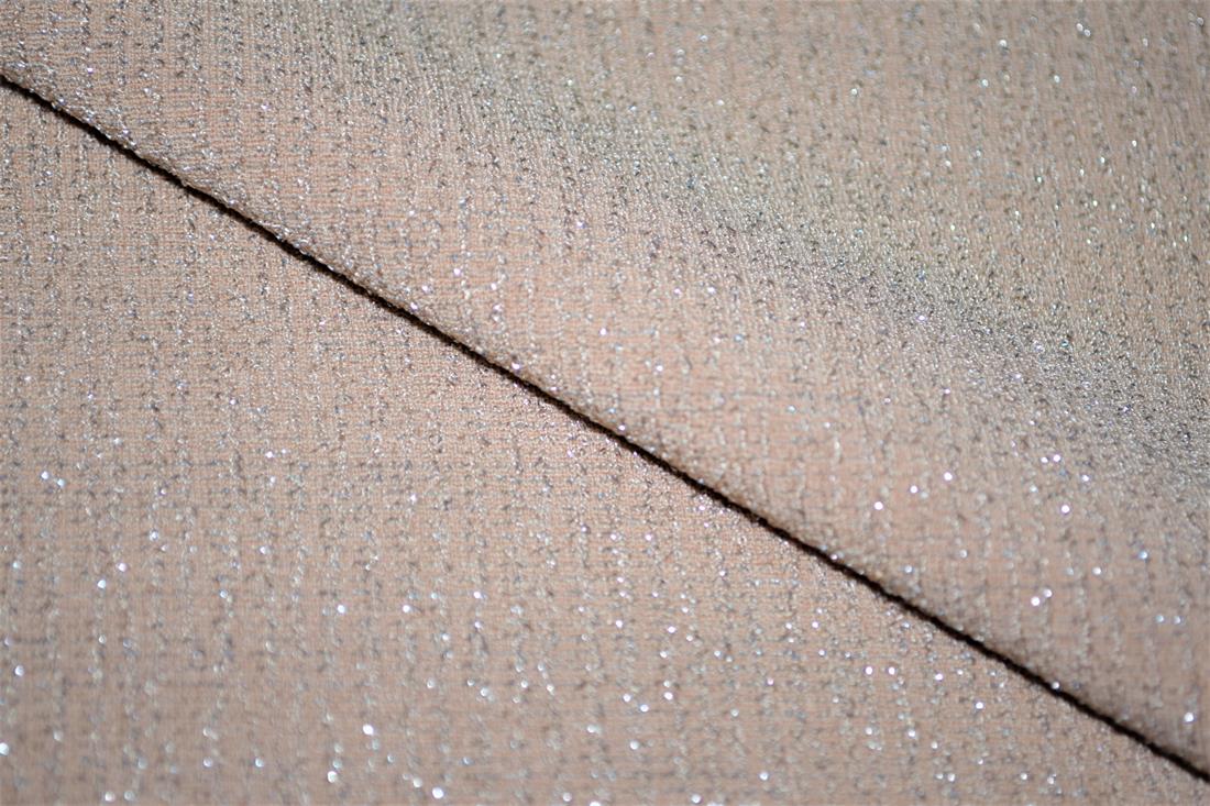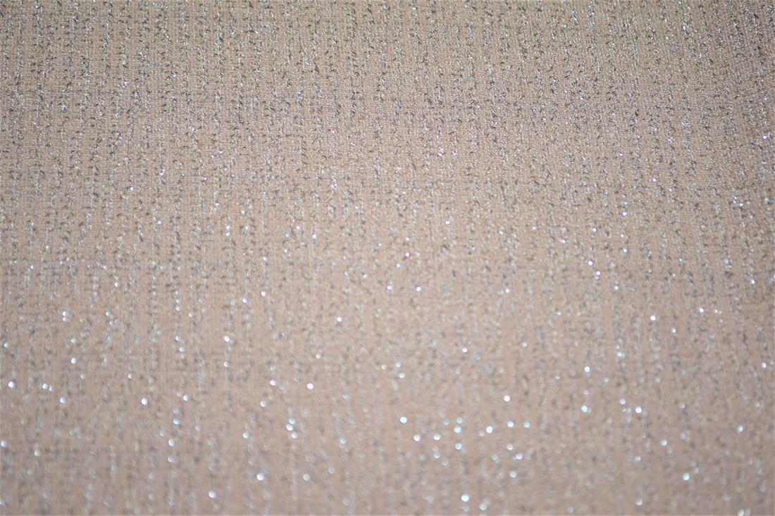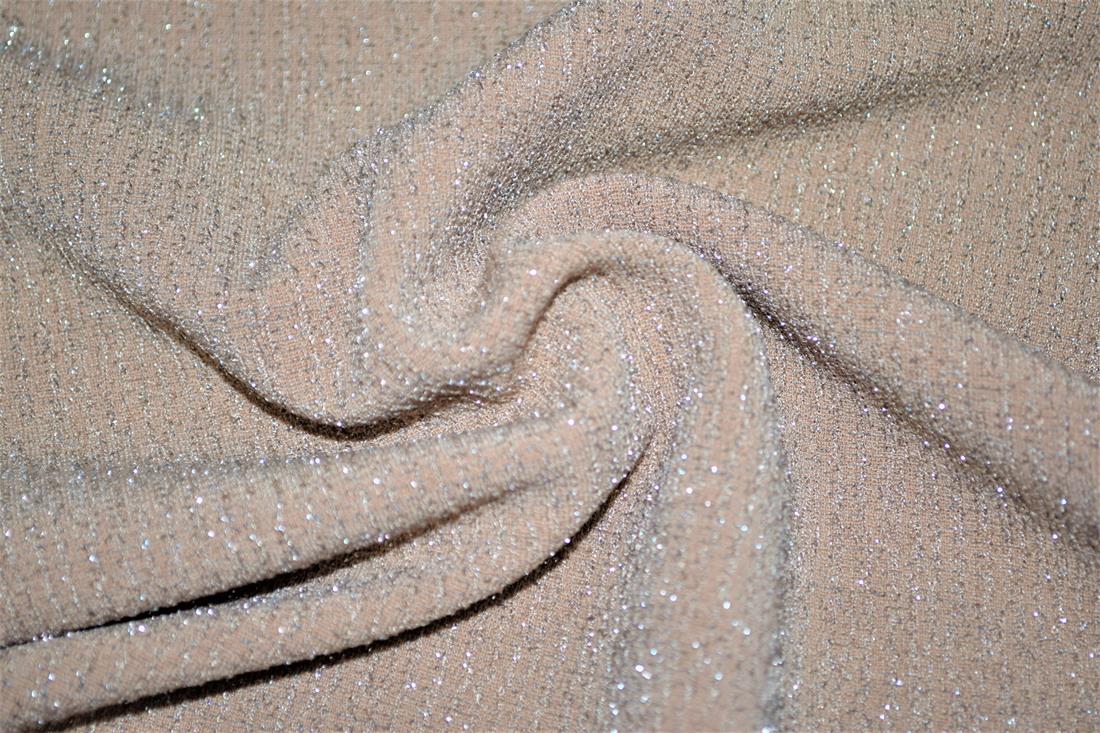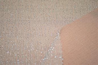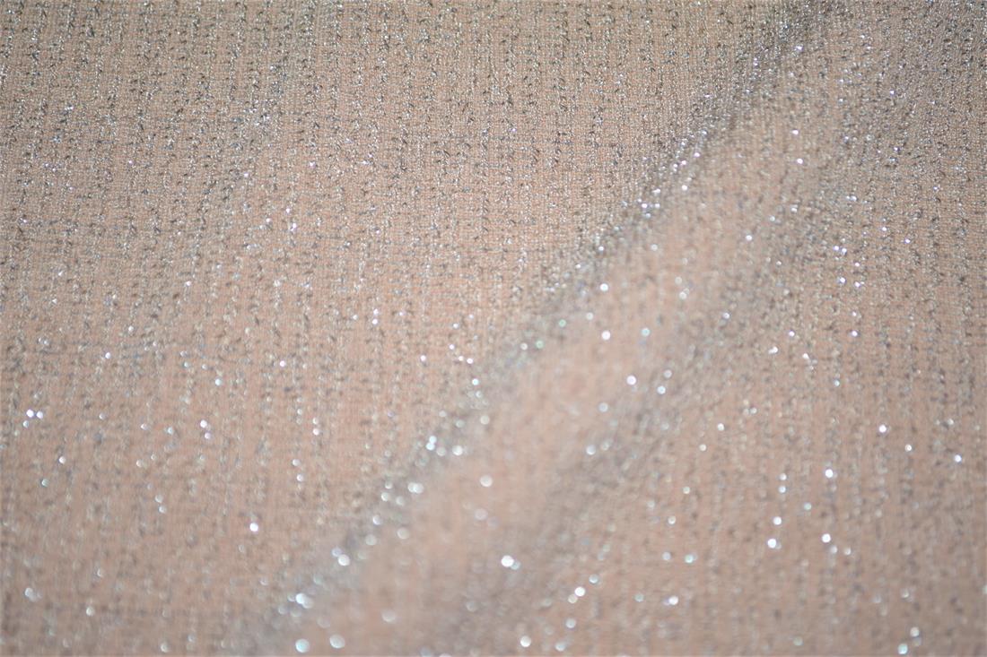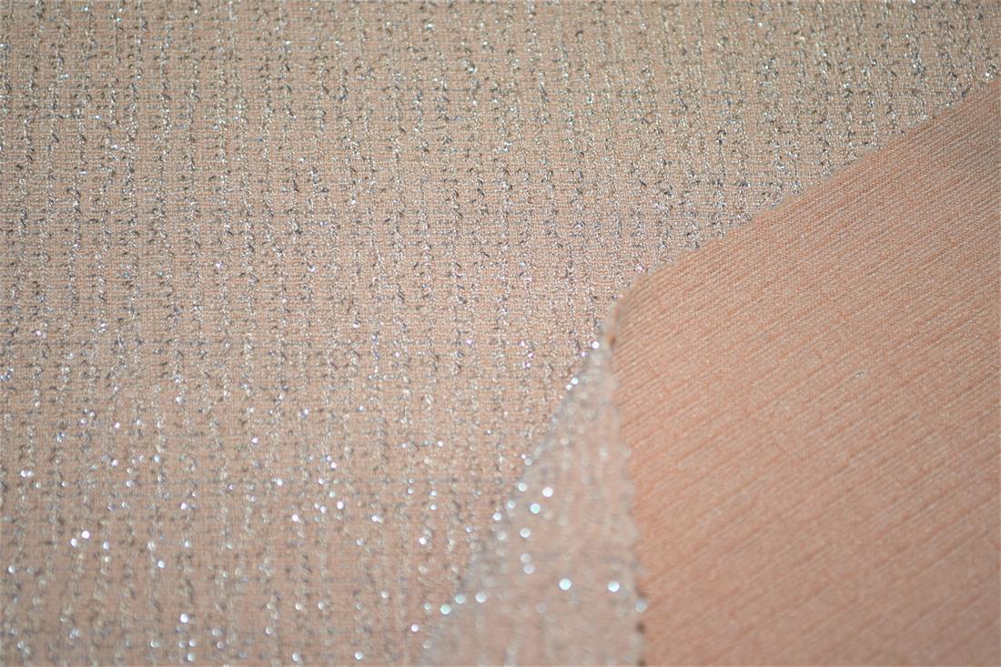 This jersey fabric features lurex sparkles running throughout the surface. The shiny lurex on the front gives it a sandy texture while the woven backing gives it a soft finish.