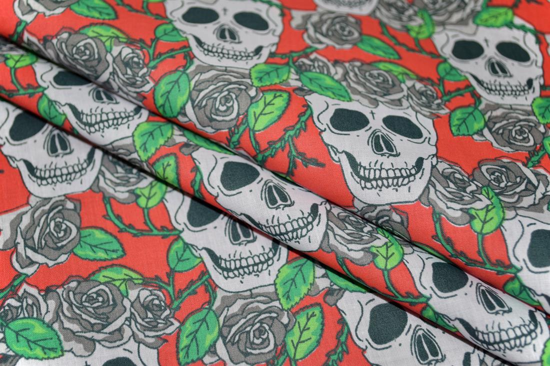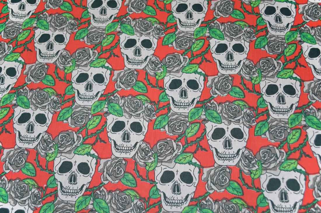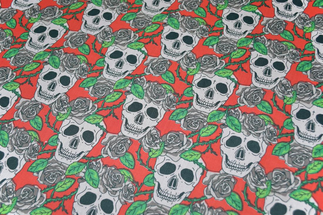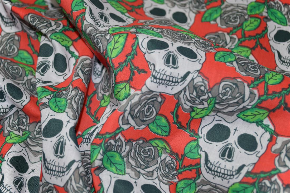 Skulls Printed Polycotton Fabric, 80% Polyester and 20% Cotton, 112cm Wide, High Quality; Weight; 90gsm Our polycotton prints are made from a blend of polyester and cotton. This lightweight fabric is ideal for clothing, cushion-covers, bed sheets, tablecloths, napkins, face masks, crafts, and much more. Colours may slightly vary due to the lighting during the photo shooting or the monitor's display.