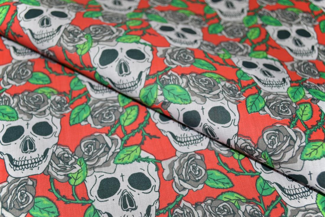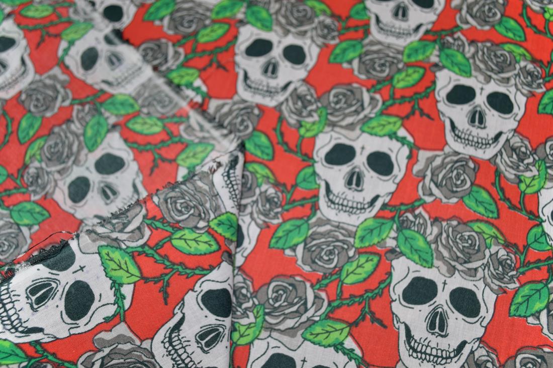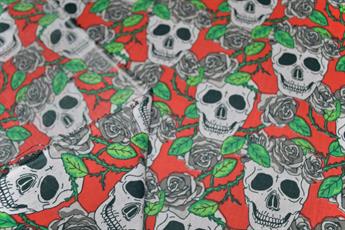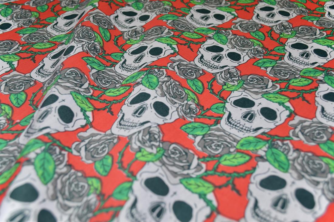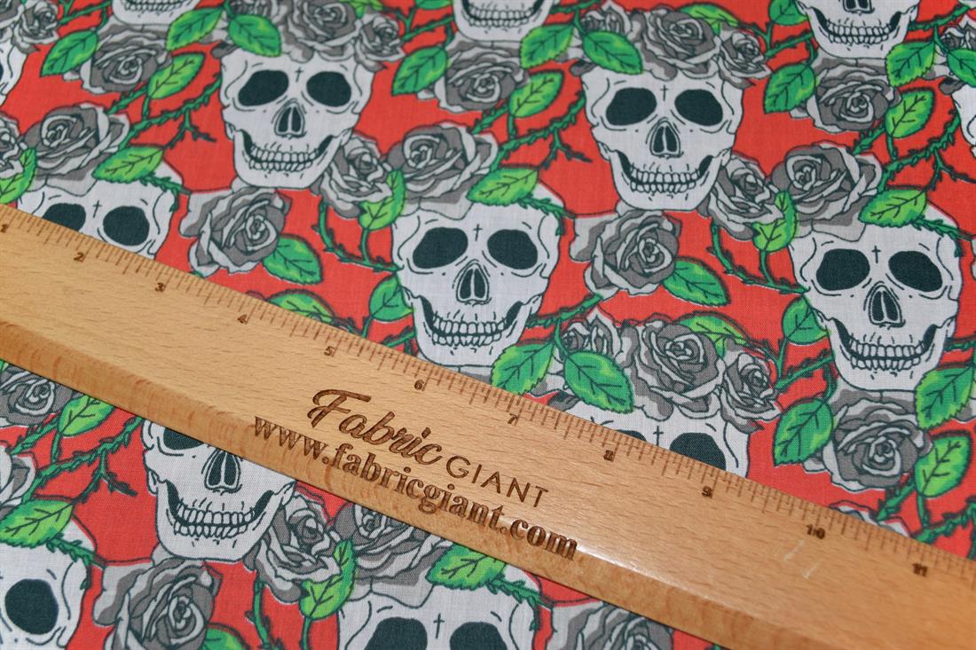 Skulls Printed Polycotton Fabric, 80% Polyester and 20% Cotton, 112cm Wide, High Quality; Weight; 90gsm Our polycotton prints are made from a blend of polyester and cotton. This lightweight fabric is ideal for clothing, cushion-covers, bed sheets, tablecloths, napkins, face masks, crafts, and much more. Colours may slightly vary due to the lighting during the photo shooting or the monitor's display.