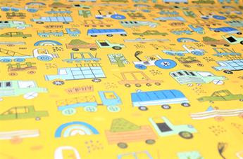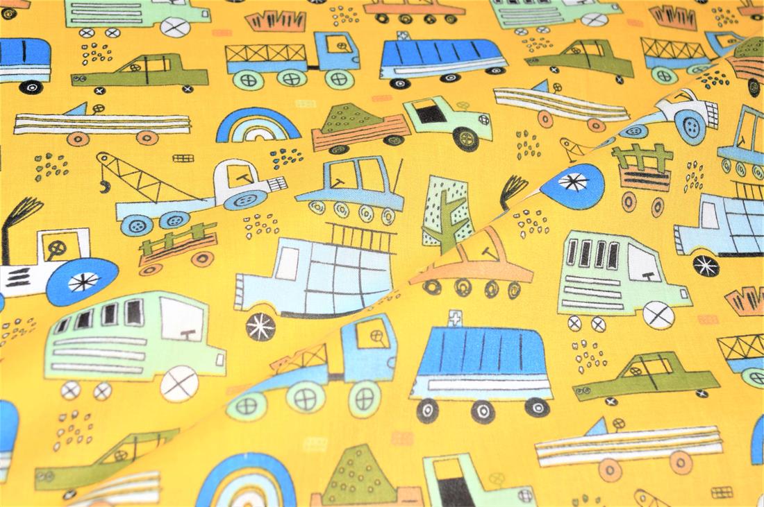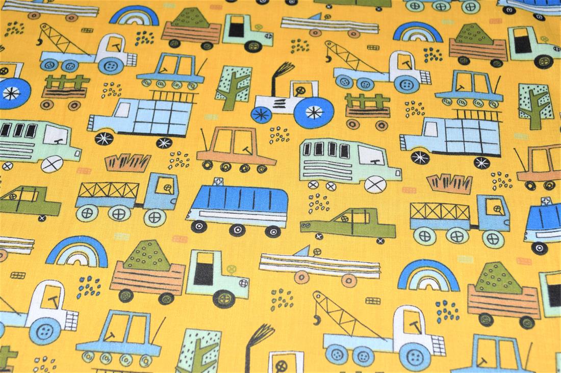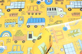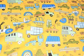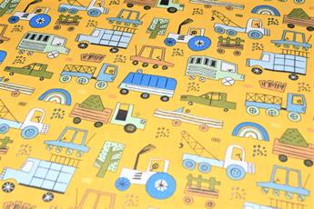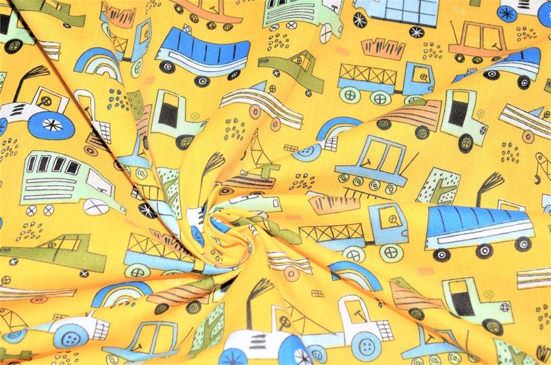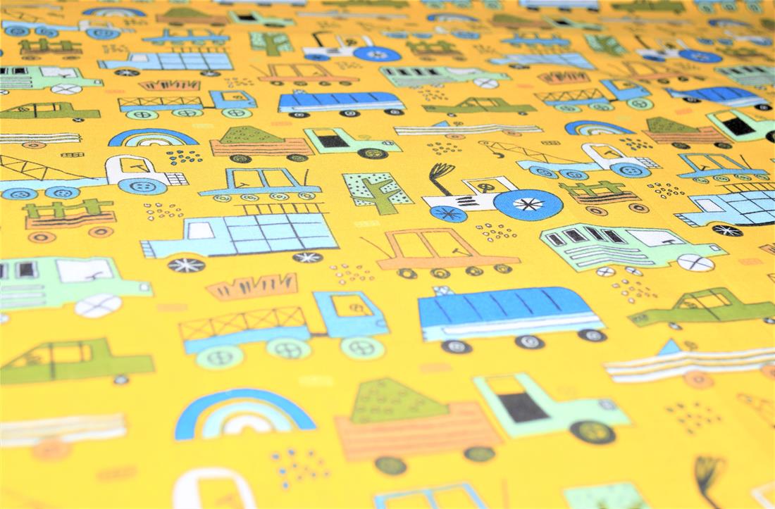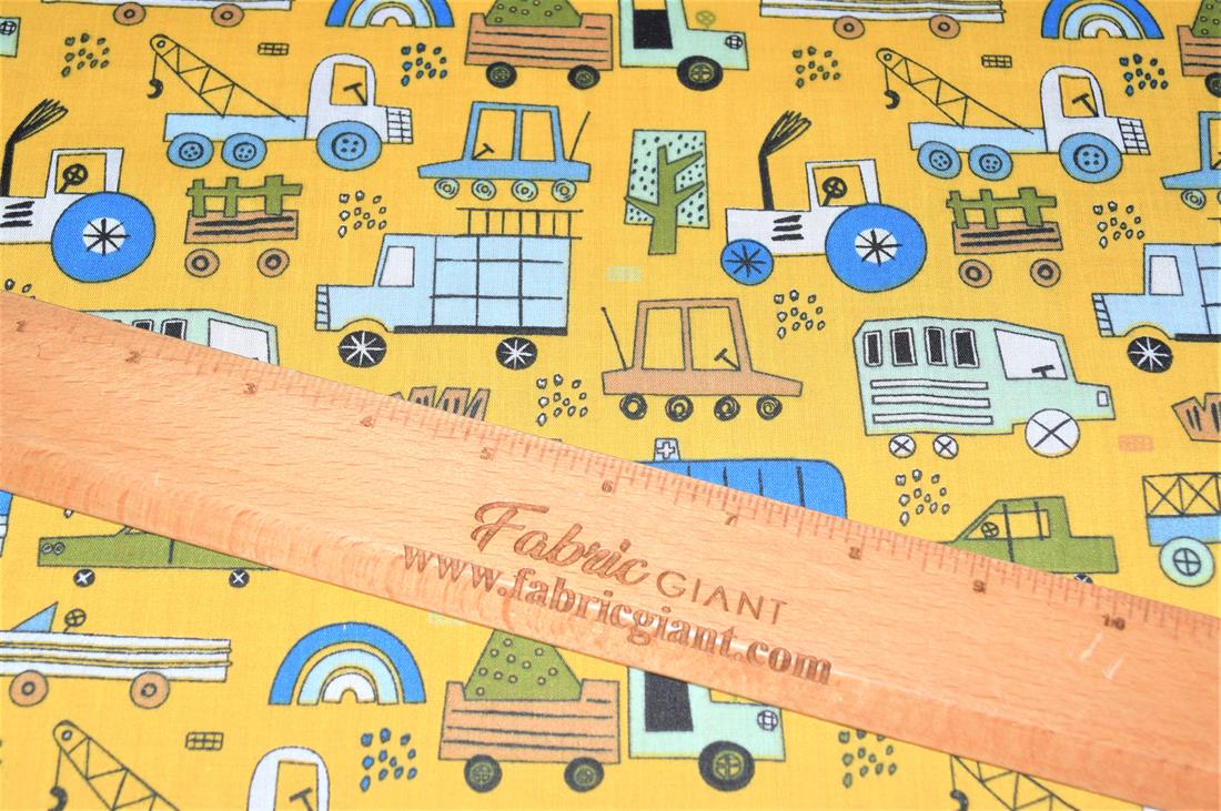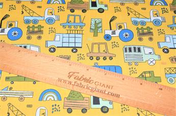 Construction Fun- Printed Polycotton Fabric, 80% Polyester and 20% Cotton, 112cm Wide, High Quality; Weight; 90gsm Our polycotton prints are made from a blend of polyester and cotton. This lightweight fabric is ideal for clothing, cushion-covers, bed sheets, tablecloths, napkins, face masks, crafts, and much more. Colours may slightly vary due to the lighting during the photo shooting or the monitor's display.