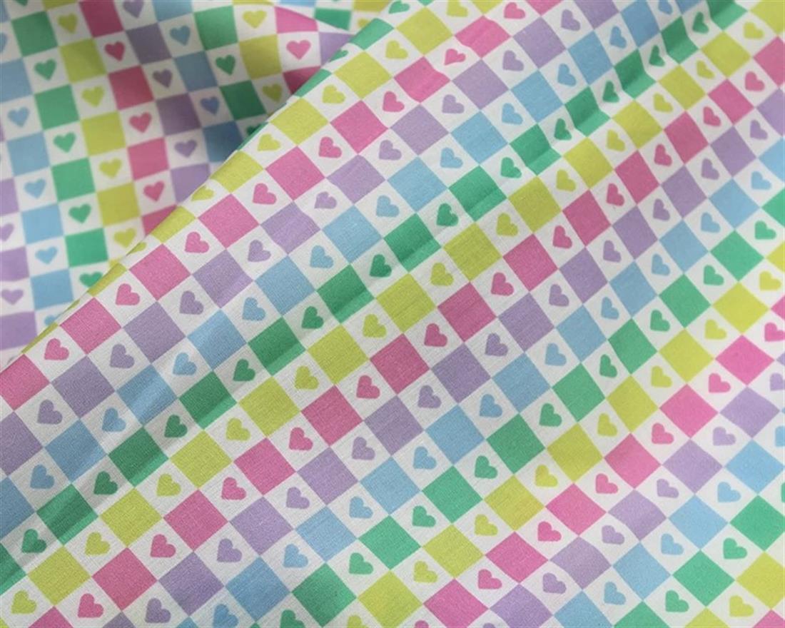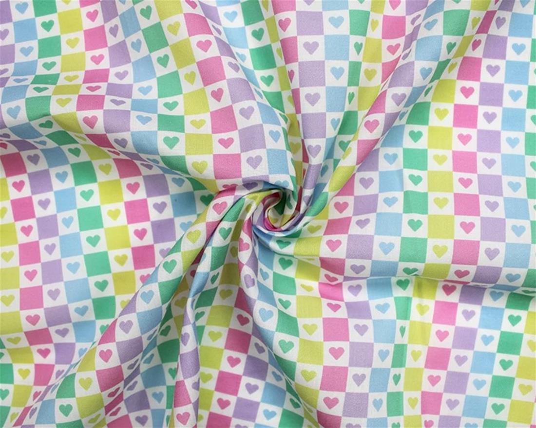 A playful polycotton fabric featuring digital love-themed checkered prints, perfect for fun clothing, accessories, and craft projects.