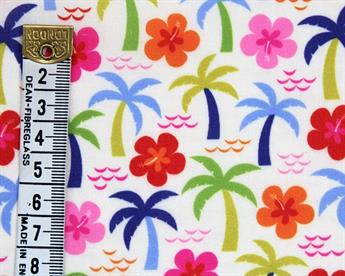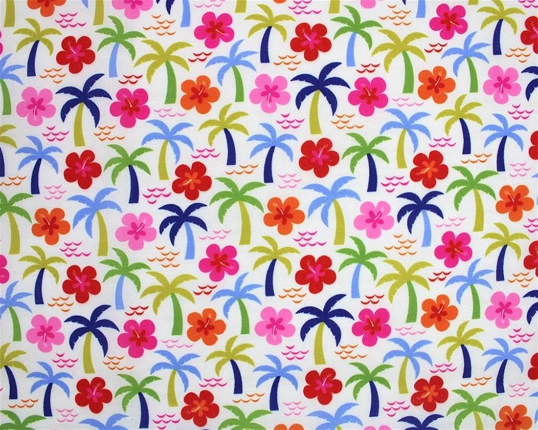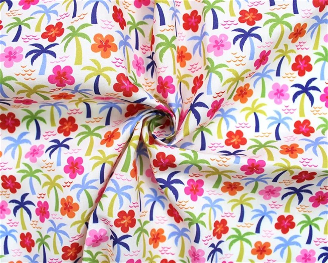 A lightweight polycotton fabric featuring vibrant digital palm prints, perfect for tropical-themed clothing, accessories, and crafts.