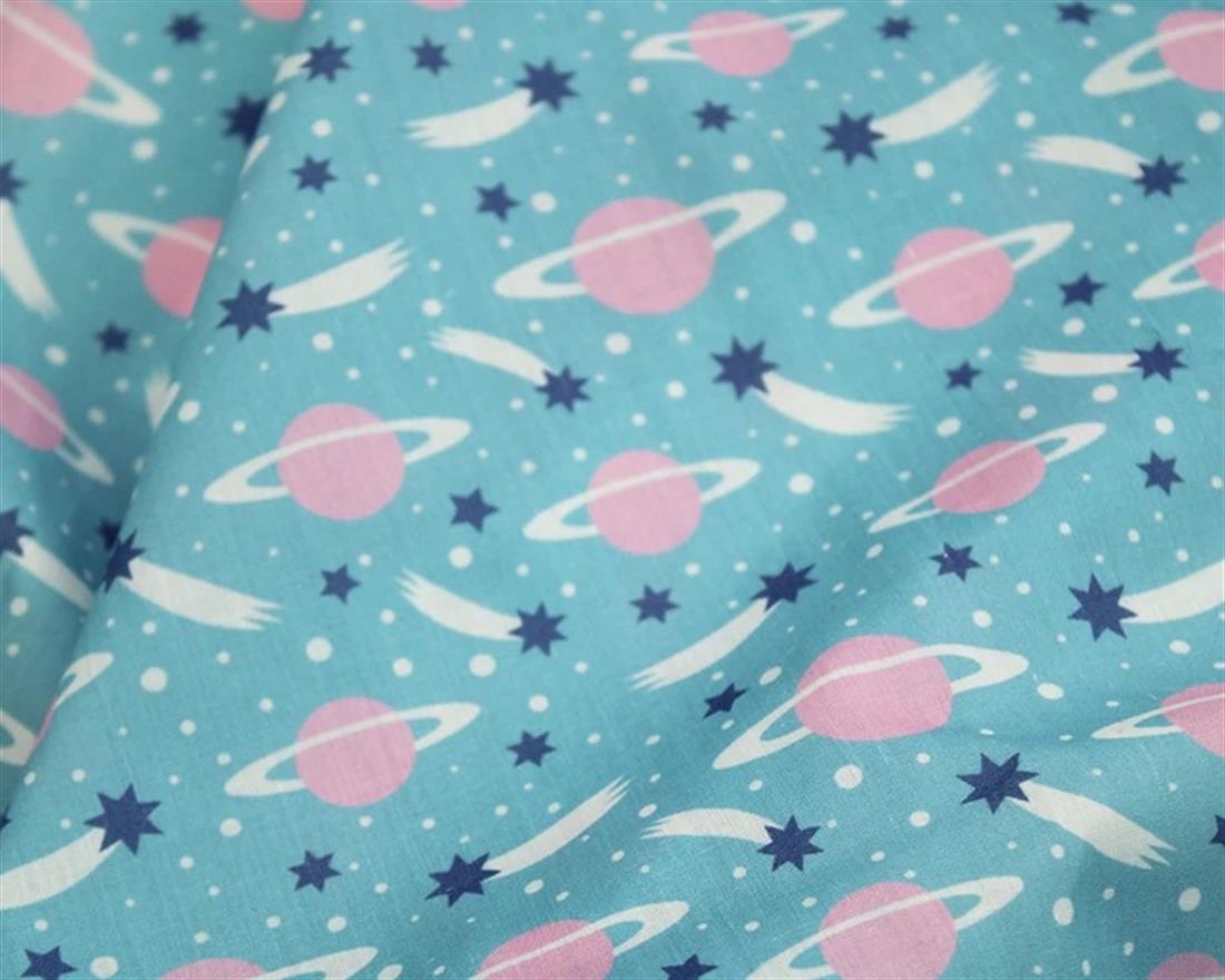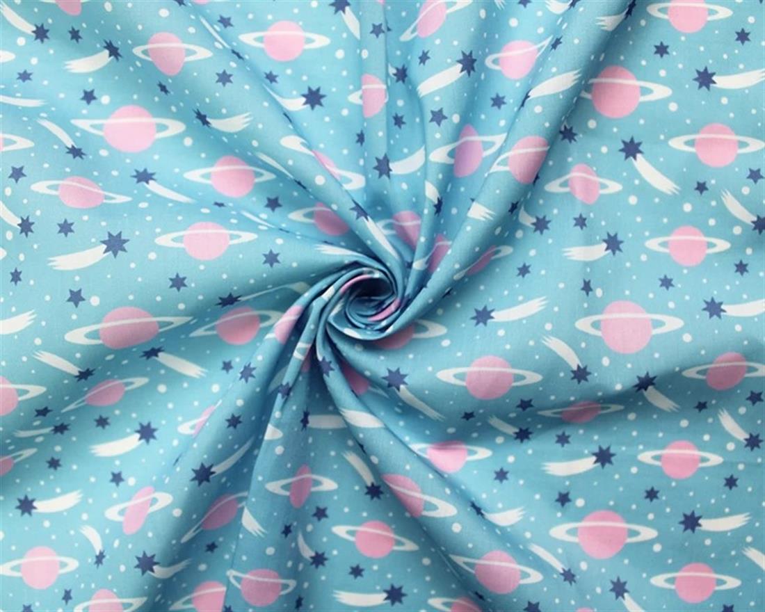 A cosmic polycotton fabric featuring vibrant digital planet prints, perfect for space-themed clothing, accessories, and craft projects.