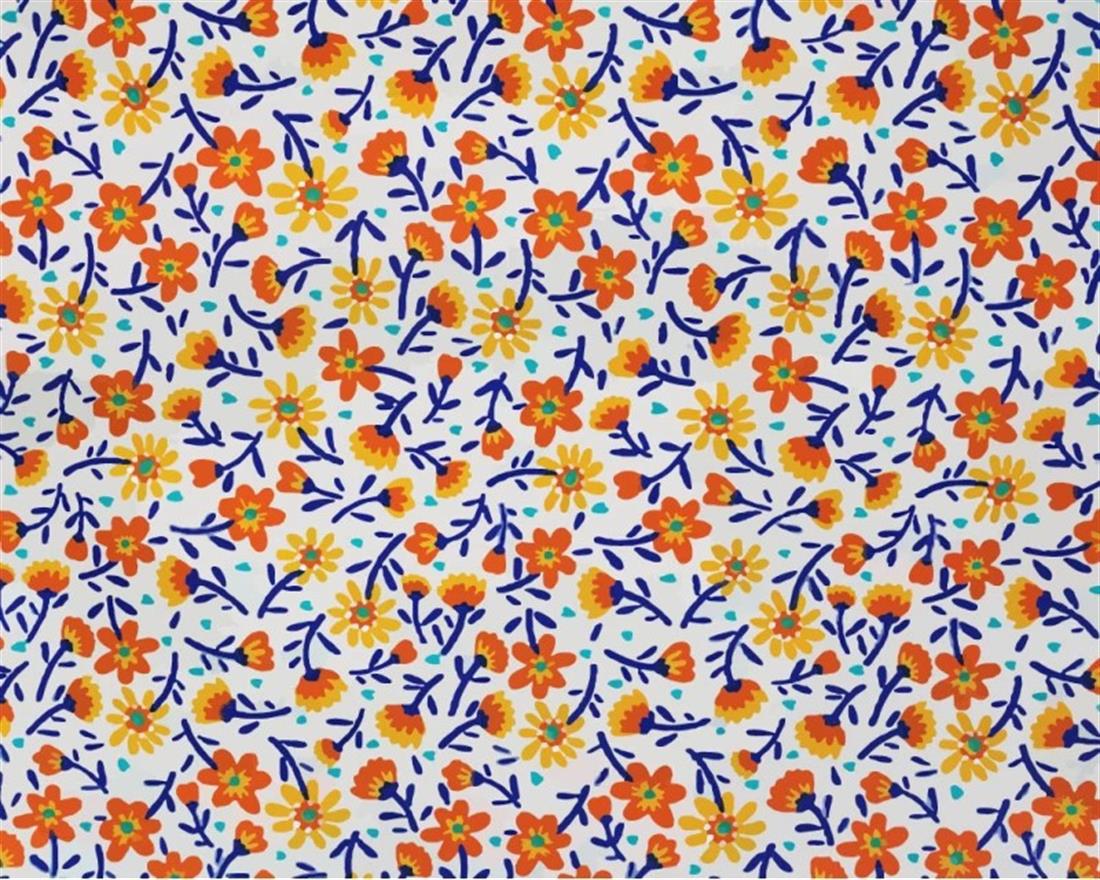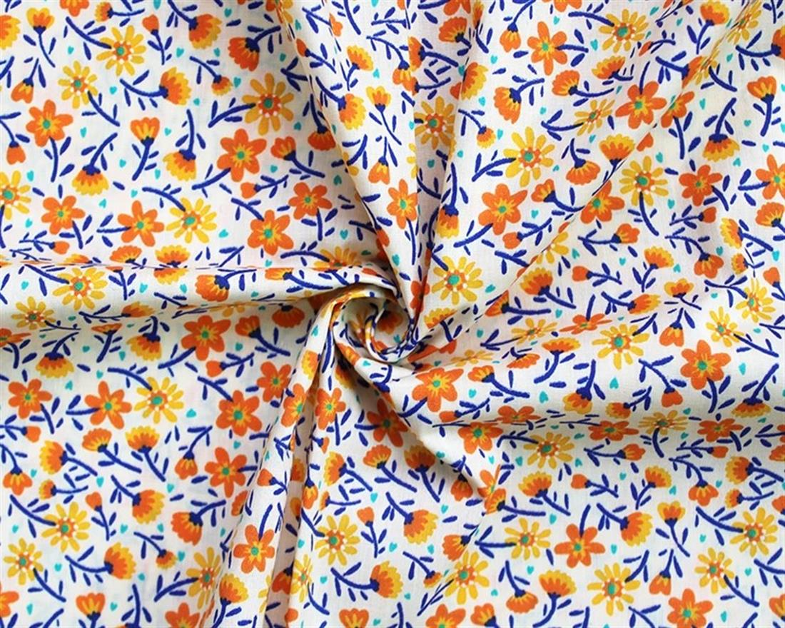 A soft, durable polycotton fabric featuring small, scattered floral or geometric prints, perfect for crafts and sewing projects.