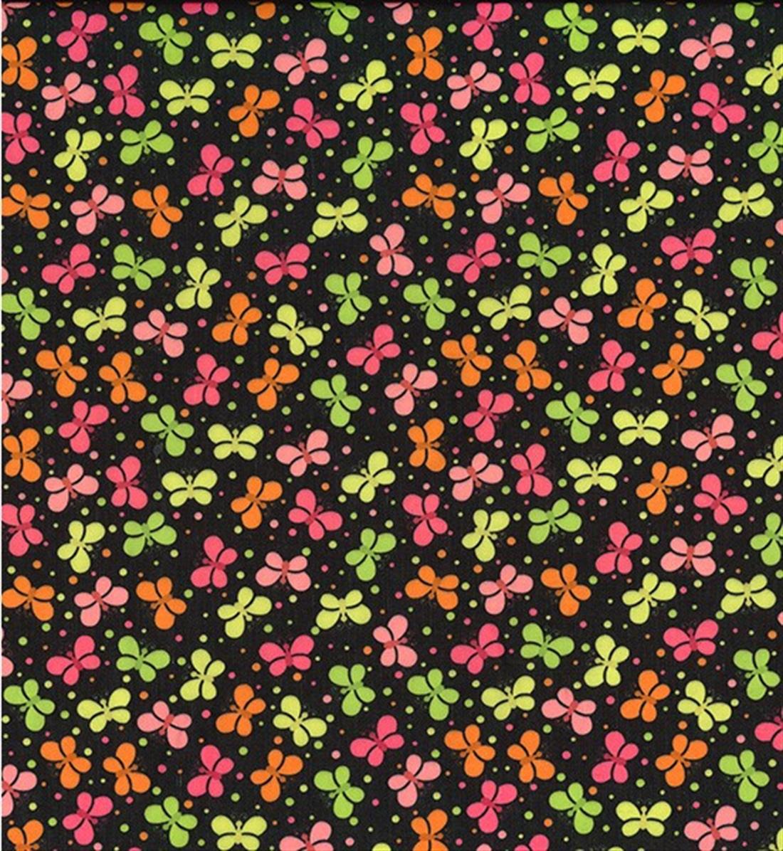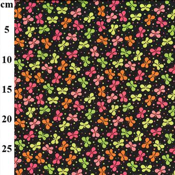 Brighten up your sewing projects with this Butterflies on Black Polycotton Fabric. Featuring neon pink, orange, and green butterflies with matching polka dots scattered across a deep black background, this playful design is perfect for both children’s and adult projects alike.