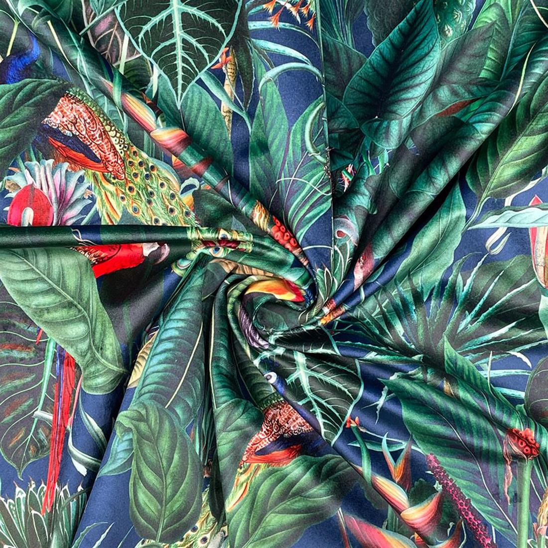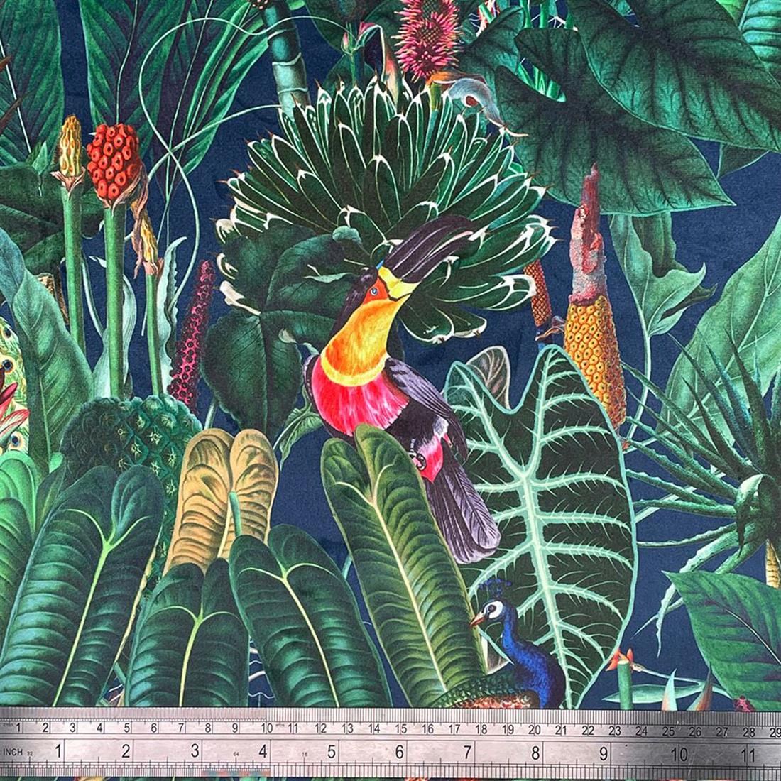 Rainforest- Luxury Digitally printed, soft & durable Velvet fabric witha plush finish It is supreme quality fabric, which would be ideal for a multitude of furnishing projects including Cushions. Fabric is cut from the roll and multiple purchases will be cut in one continuous piece. Please note colours may vary slightly due to different screen settings . 100% Polyester . 58 inch (148cm) . 290 Gsm . Martindale 50,000 Rubs . Dry Clean Only
