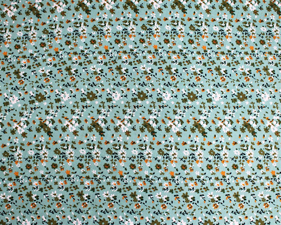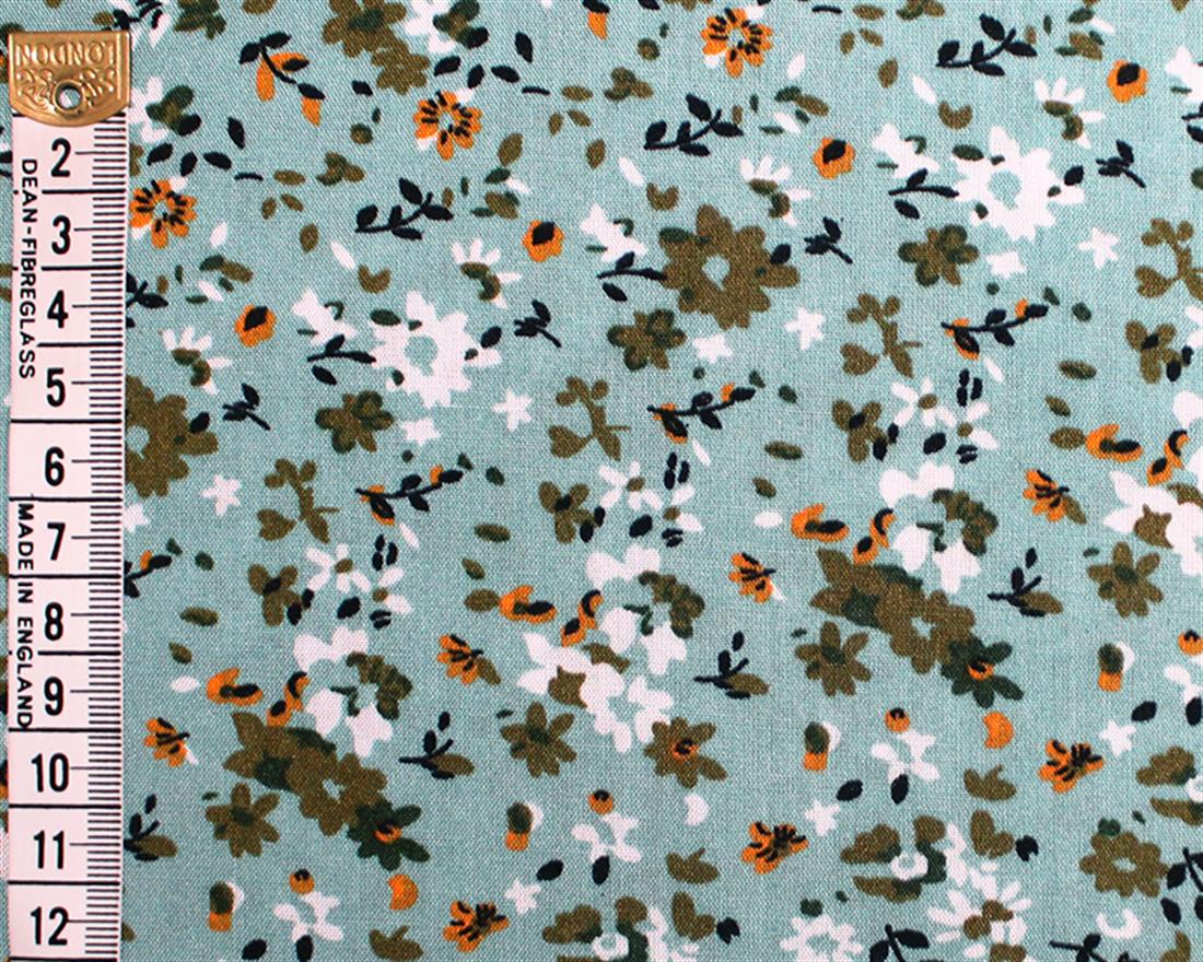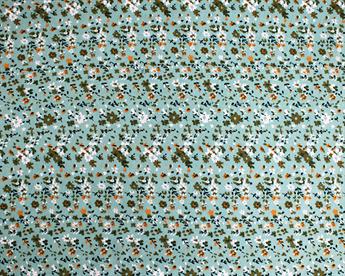 Featuring delicate 'ditsy flowers scattered on a background of green, blue, and pink with scattered leaves and dots.