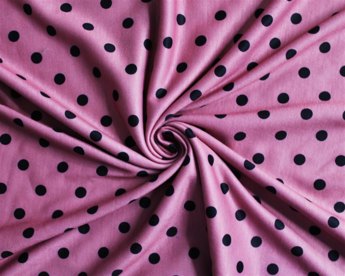 This fabric features a simple yet classic black pin spot design set against a Chateau Rose background.