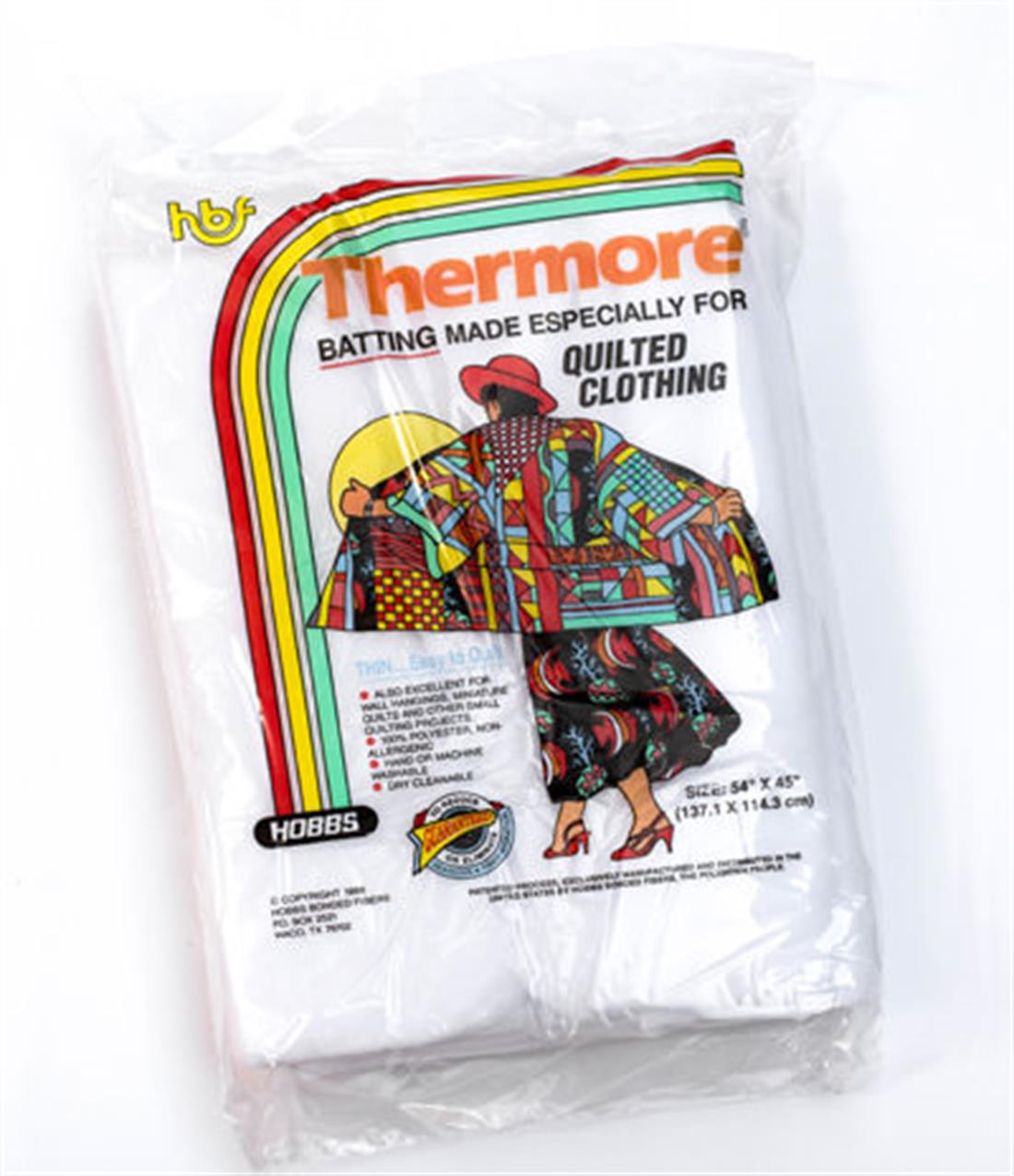 Hobbs Thermore Ultra-Thin 54 x 45in (Clothing) This unique, patented product is a thin, drapable, migration free, polyester batting that is excellent for both hand or machine quilting. Can be quilted up to 6-8 inches apart with no shrinkage. Made especially for quilted clothing, miniatures and all projects where an extremely thin a drapable batting is needed.