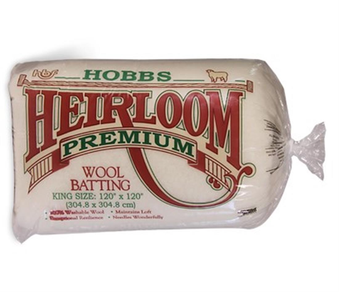 Hobbs Heirloom 100% Wool Wadding 120 Inch x 120 Inch (King) The finest natural wool batting in the world! Washable, breathable and exceptionally easy to quilt by hand or machine, and can be quilted up to 4 inches apart. Resin bonded to resist fibre migration. Test if using with dark fabric.