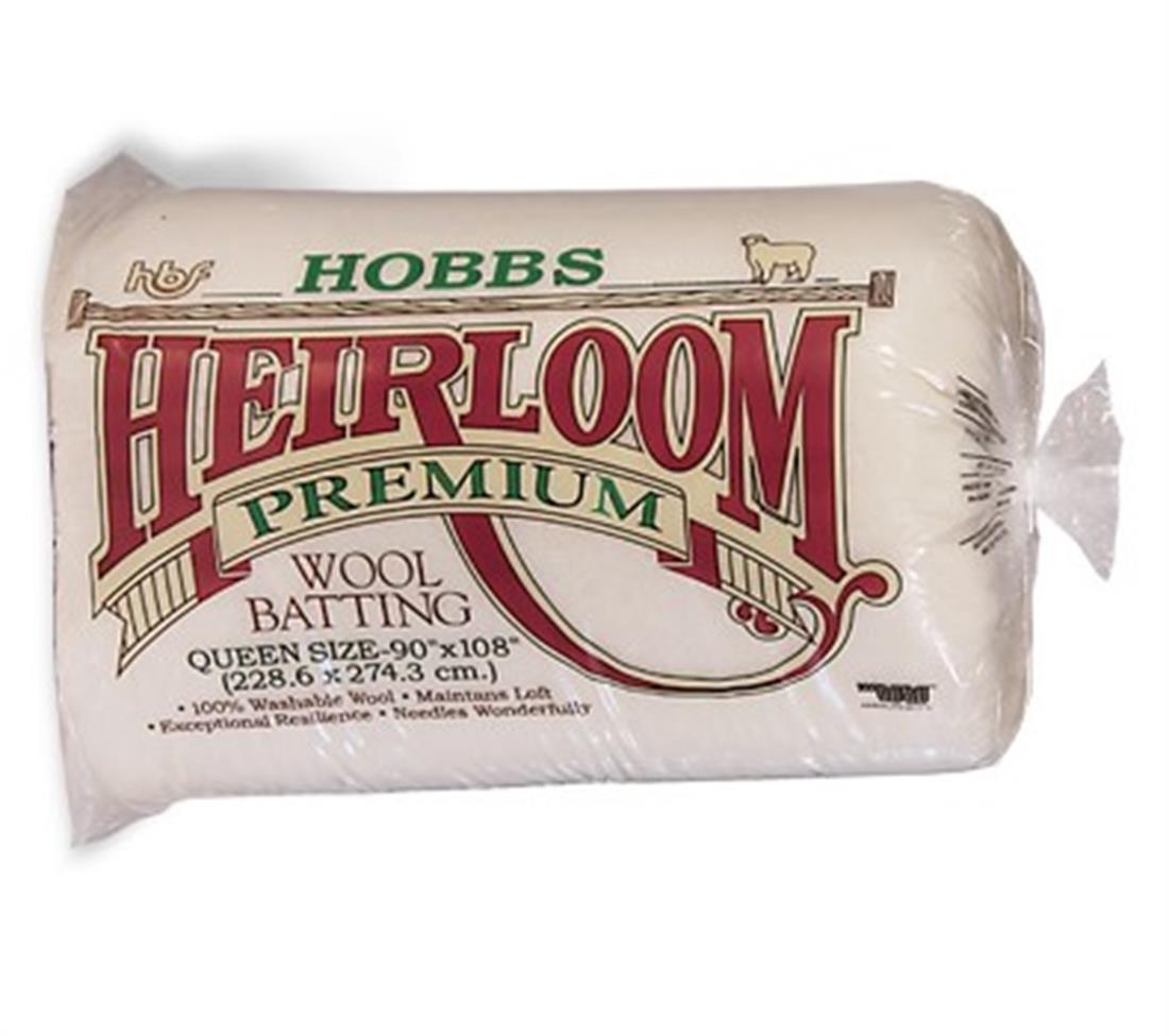 Hobbs Heirloom 100% Wool Wadding 90 Inch x 108 Inch (Queen) The finest natural wool batting in the world! Washable, breathable and exceptionally easy to quilt by hand or machine, and can be quilted up to 4 inches apart. Resin bonded to resist fibre migration. Test if using with dark fabric.