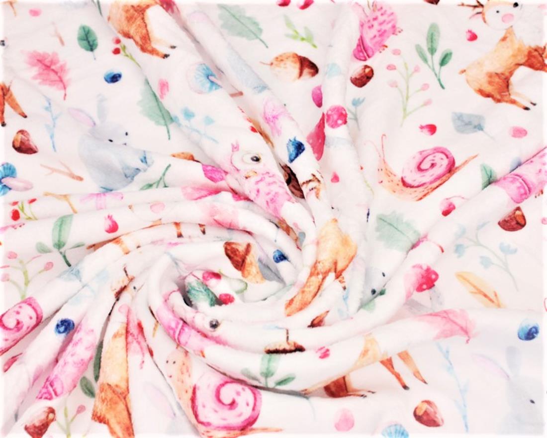 Forest Animals Digital Bubs Fleece I fernly believe that this is a qualitree fabric! Featuring a selection of illustrated, cute, forest animals and plants set out against a white background. These forest animals and plants consist of little deer, owls, snails, bunnies, mushrooms, berries, leaves, florals and acorns. Fleece is a synthetic insulating fabric made from a type of polyester. It is very comfortable due to its light weight and anti-perspiration qualities, and allows moisture to evaporate, while blocking humidity from the outside. Composition: 100% Polyester Weight: 300gsm Width: 59inch 30°C wash / do not bleach / warm iron / professional dry clean / do not tumble dry