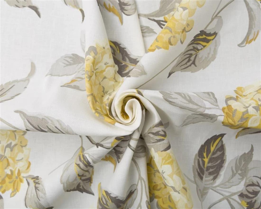 Celebrate timeless British florals with Laura Ashley Hydrangea Camomile. This striking canvas-weight cotton-linen blend features painterly hydrangea clusters in warm camomile yellows with soft grey-green leaves, set on a fresh white base. The design evokes country gardens in bloom, perfect for creating a bright, inviting feel in any space.