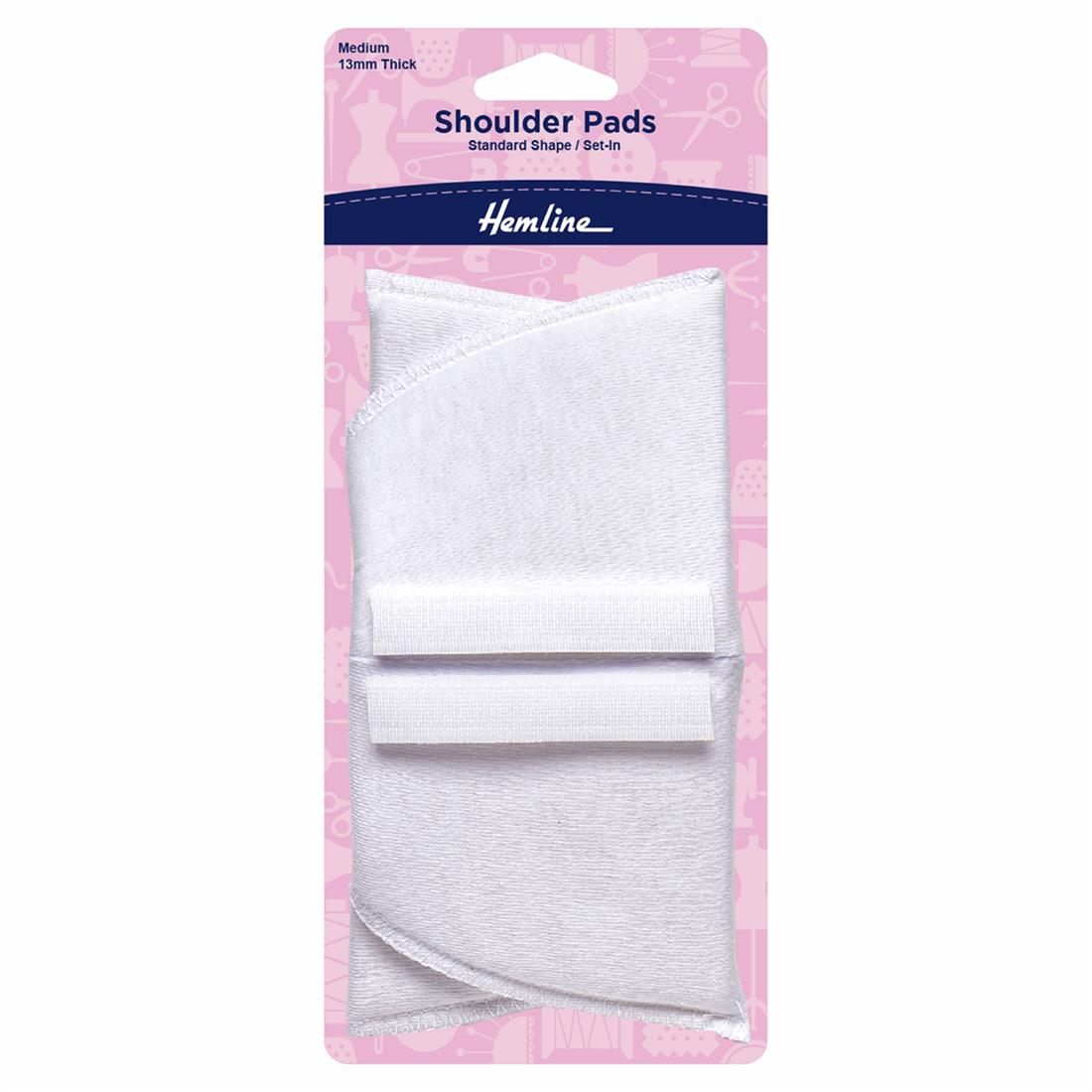 Soft foam pads with a 100% cotton cover. Standard shaped shoulder pads for set-in style sleeves. Exclusive sew-in /iron-on hook and loop supplied with most pads to convert to a detachable pad if required. White, 1 pair: 15 x 10cm, 13mm thick.