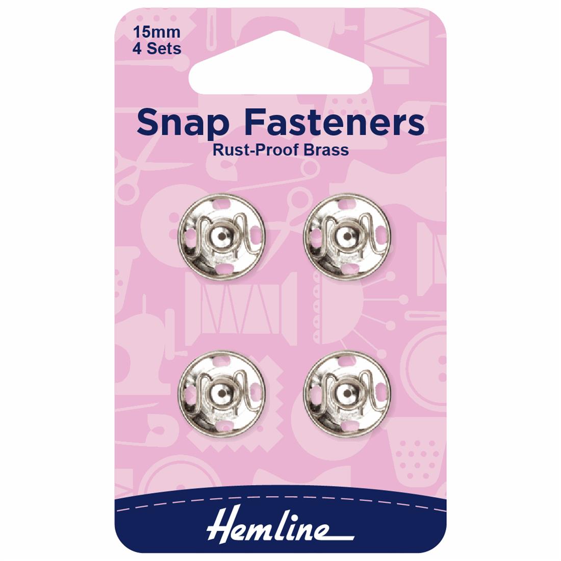 Sew-on, rustproof brass snap fasteners. Quick and easy to attach, ideal for sewing projects around the home. Central guide holes in both top and bottom assist perfect alignment when fitting. Nickel, 4 sets - 15mm, 5/8in.