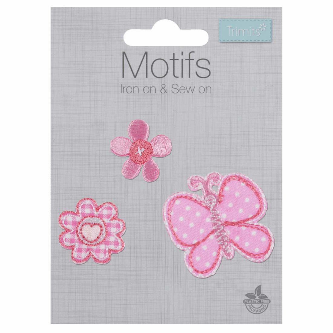 A selection of children's and adult motif designs. Ideal for clothes embellishment. Butterfly: H 3.5 x W 3.5cm, Flowers: H 2.4 x W 2.5cm.