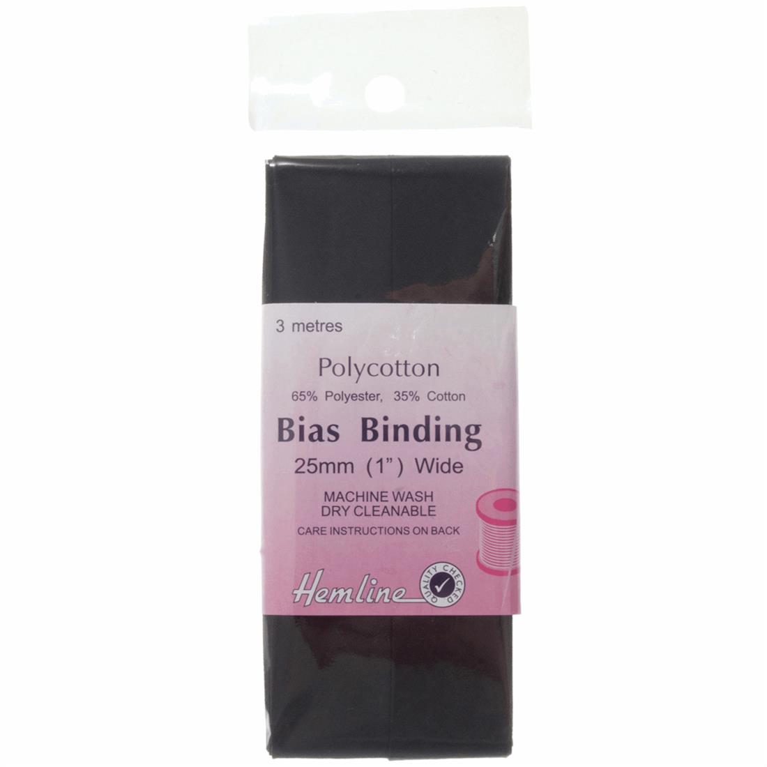 Polycotton Bias Binding - 65% Polyester, 35% cotton. Available in 20 shades and 2 widths. Machine washable and dry cleanable. 25mm, 1in. 2.5m/2.5yrds.