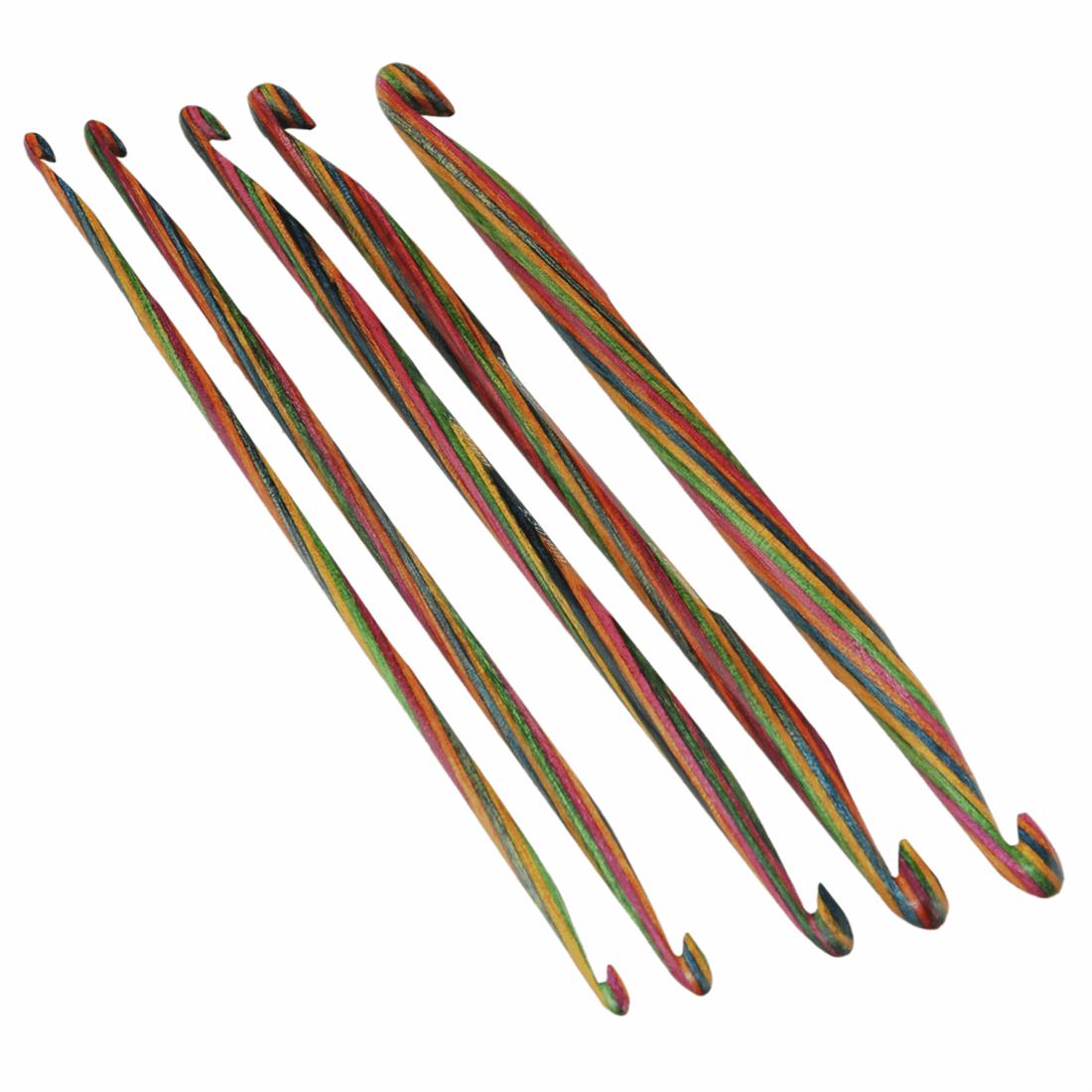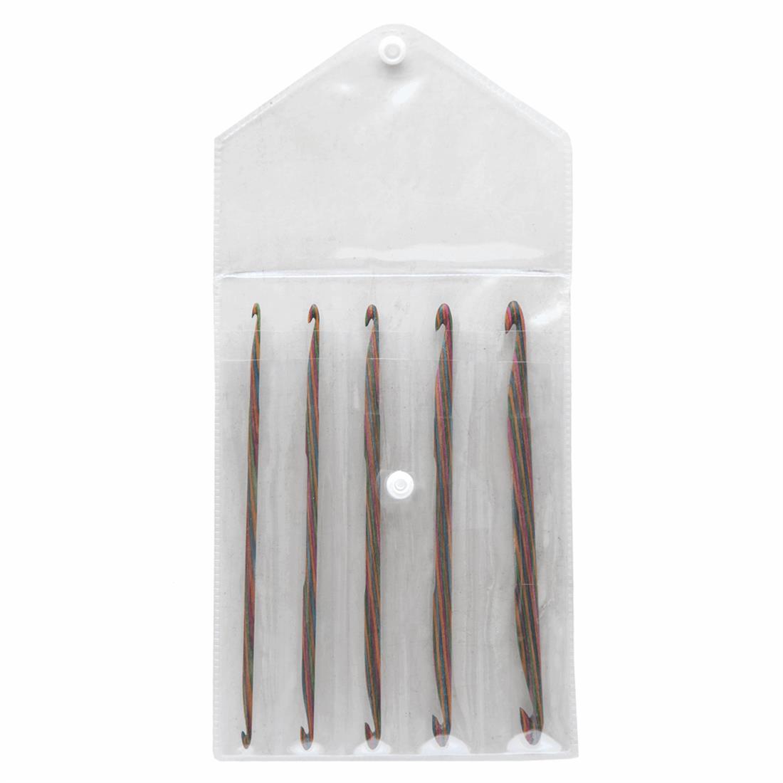 This Symfonie crochet hook set is packaged in a clear vinyl bag. Contains 5 double ended hooks in sizes: 3-3.5, 4-4.5, 5-5.5, 6-6.5 and 7-8mm.